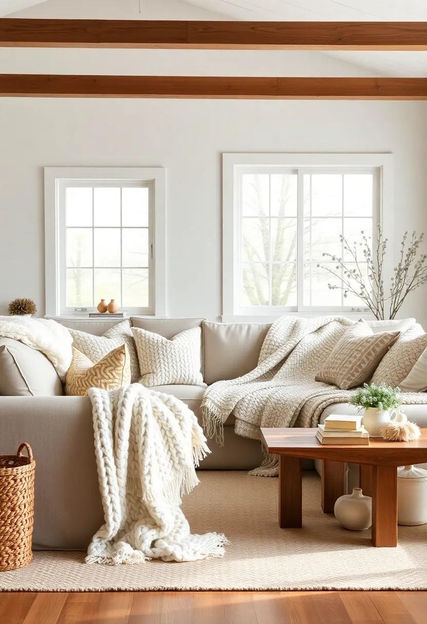 Layered Textures: Use a mix of soft fabrics like linen, wool, and cotton to create a warm yet visually appealing atmosphere in your living room