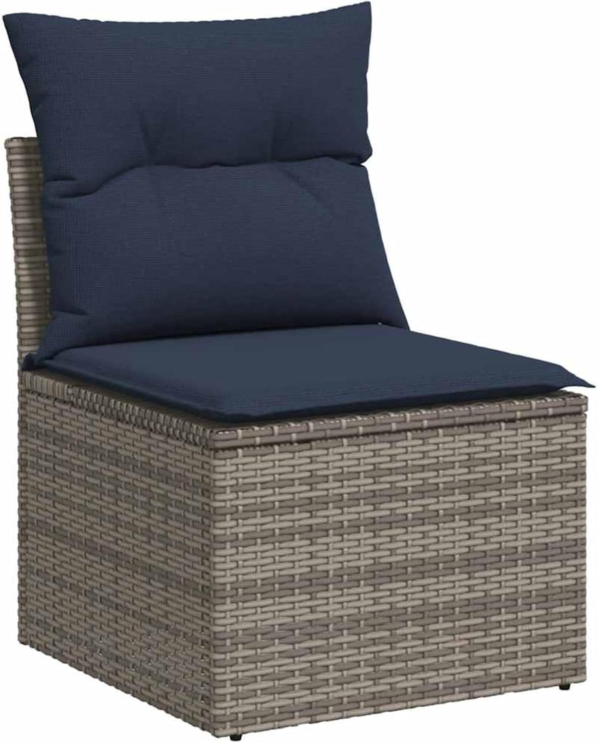 We appreciate how this outdoor set effortlessly fuses modern elegance with practical design. The gray poly rattan woven frame exudes a clean, contemporary vibe that seamlessly complements a variety of outdoor decors, from minimalist terraces to lush backyard gardens. The material’s lightweight yet robust nature makes rearranging simple, while its powder-coated steel supports ensure durability without sacrificing style. Adding to the visual appeal, the navy blue cushions provide a tasteful contrast, elevating the entire look with subtle sophistication.