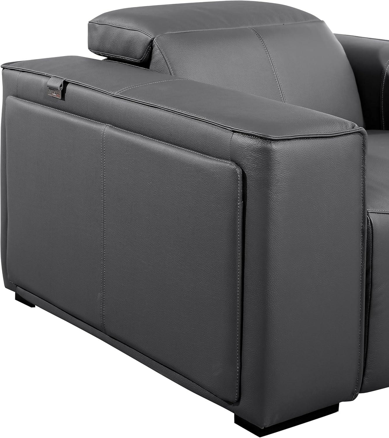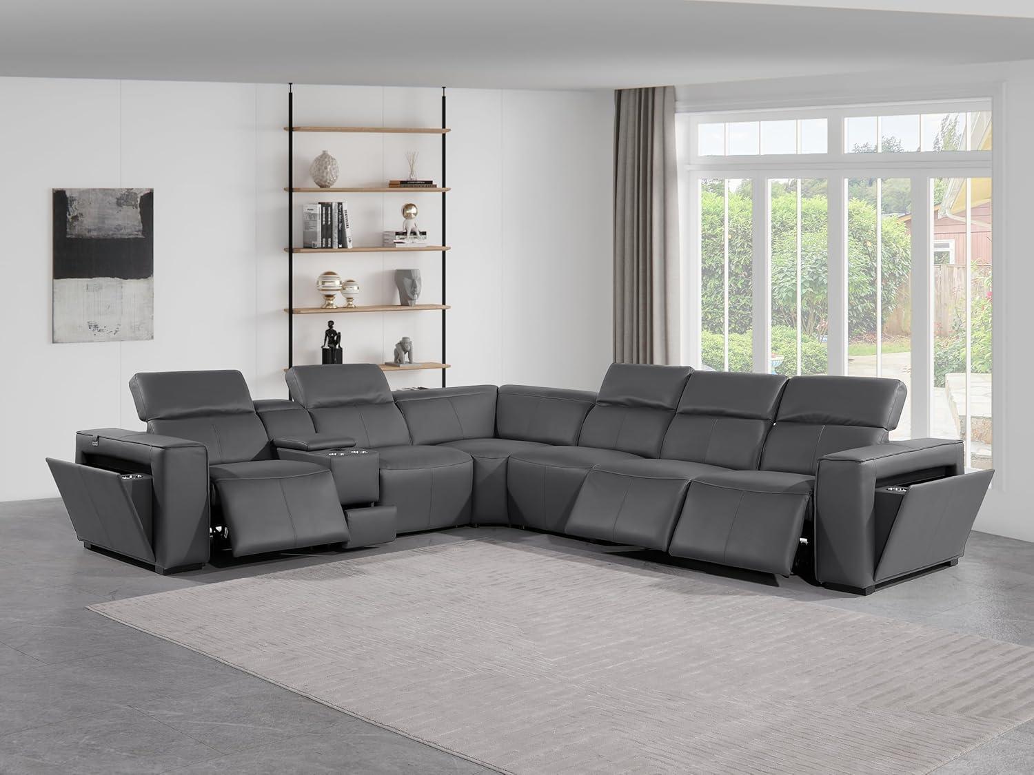 Light skims across the dark grey leather; when you walk in, the piece reads heavier in the room than it did online. The BlackJack Furniture Ernesto sectional — or just the Ernesto — settles with a low, composed silhouette that quietly anchors the space. From your vantage the L-shape draws a diagonal line through the living area, its bulk scaled more like a small sofa bank than a single couch. Your hand finds the top-grain Italian leather and feels a smooth, slightly grainy surface that yields enough to be pleasant while keeping its shape. A flip of the console reveals cupholders and hidden chargers, and a soft whir of motors answers when you press the recline buttons — everyday details that show up as you live with it rather than in a spec sheet.