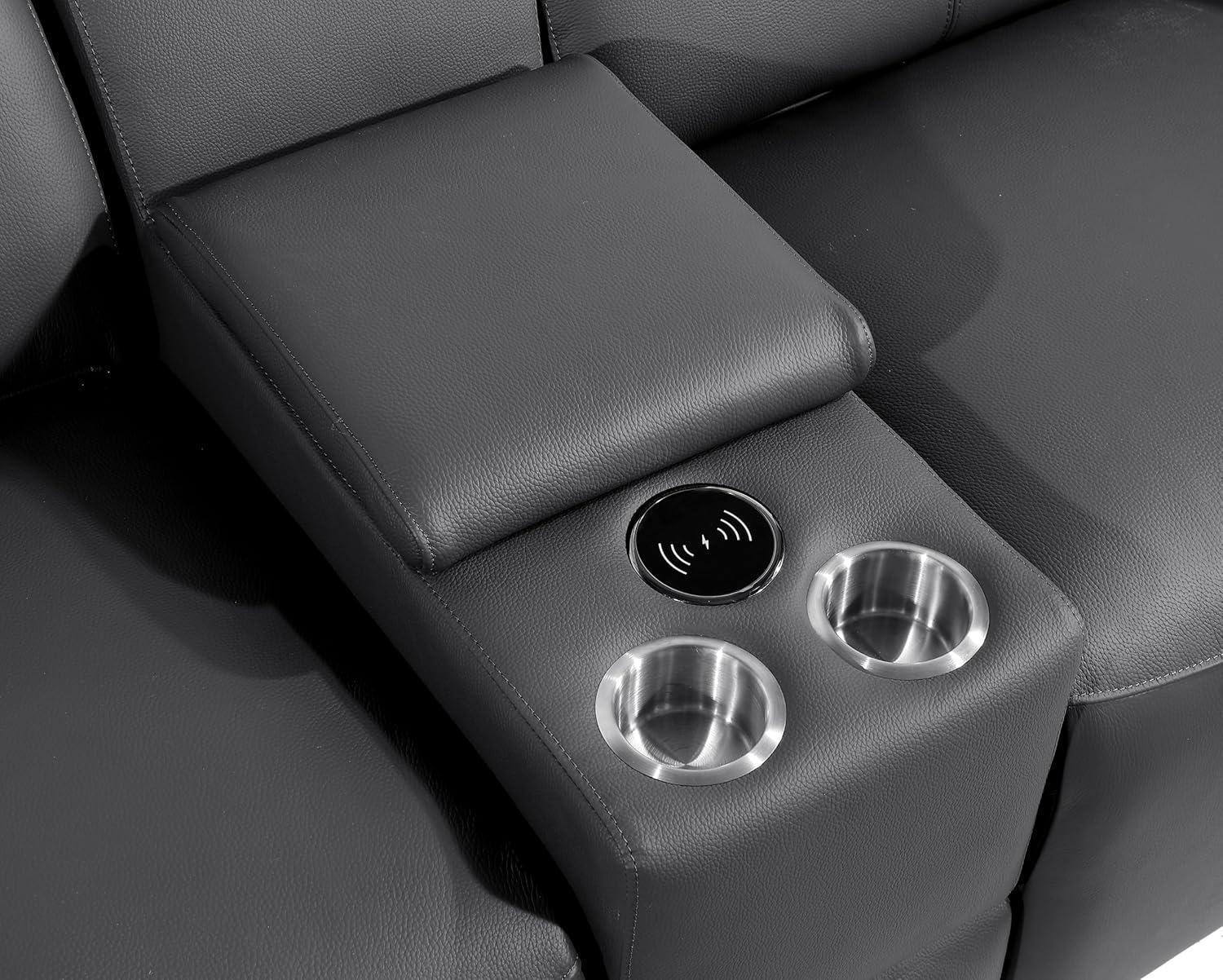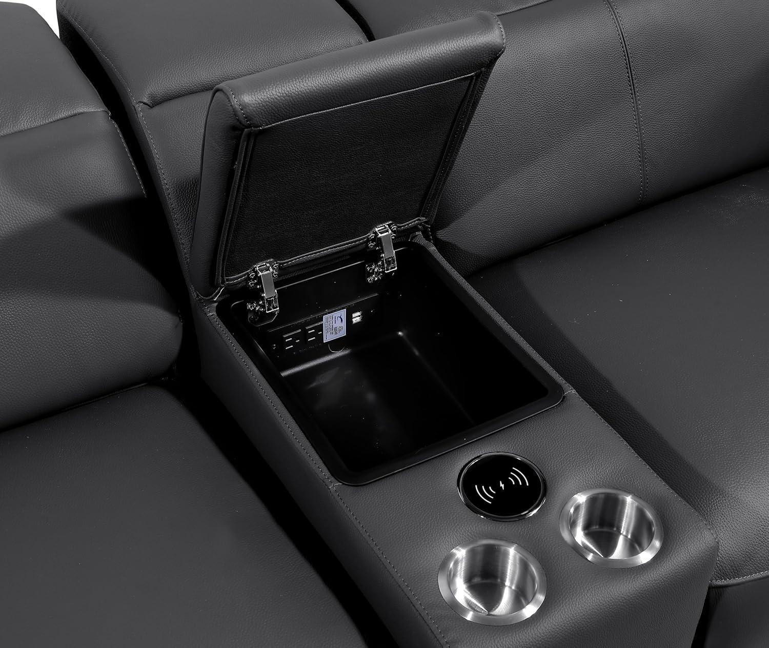When you settle into the sectional, the USB ports are the kind of convenience you reach for without thinking — a quick plug while you lean back, or a brief tug when you shift into a recline. Cables sit against the leather and sometimes curl under the cushion as you move; over time you’ll find a favored path that keeps the cord from snagging. Placing a phone on the wireless pad is often a small, habitual action: you lay it down, nudge it a fraction of an inch until the charging indicator appears, then let your hand smooth the nearby seam. Phones with thicker cases or wallets need a bit more fidgeting to find the sweet spot, and small movements on the couch can interrupt that alignment until you resettle. The ports are easy to reach from a lounging position, so charging becomes part of the rhythm of watching a show or scrolling — a task completed between adjusting a pillow and smoothing a sleeve.