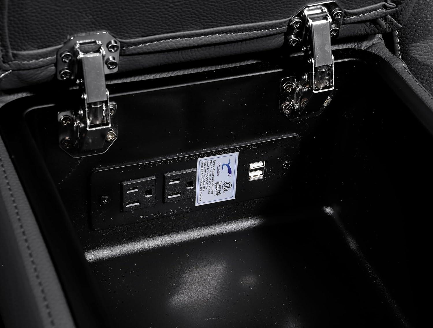 | Storage console | Hinged lid with internal ports; console closes with a soft pop |