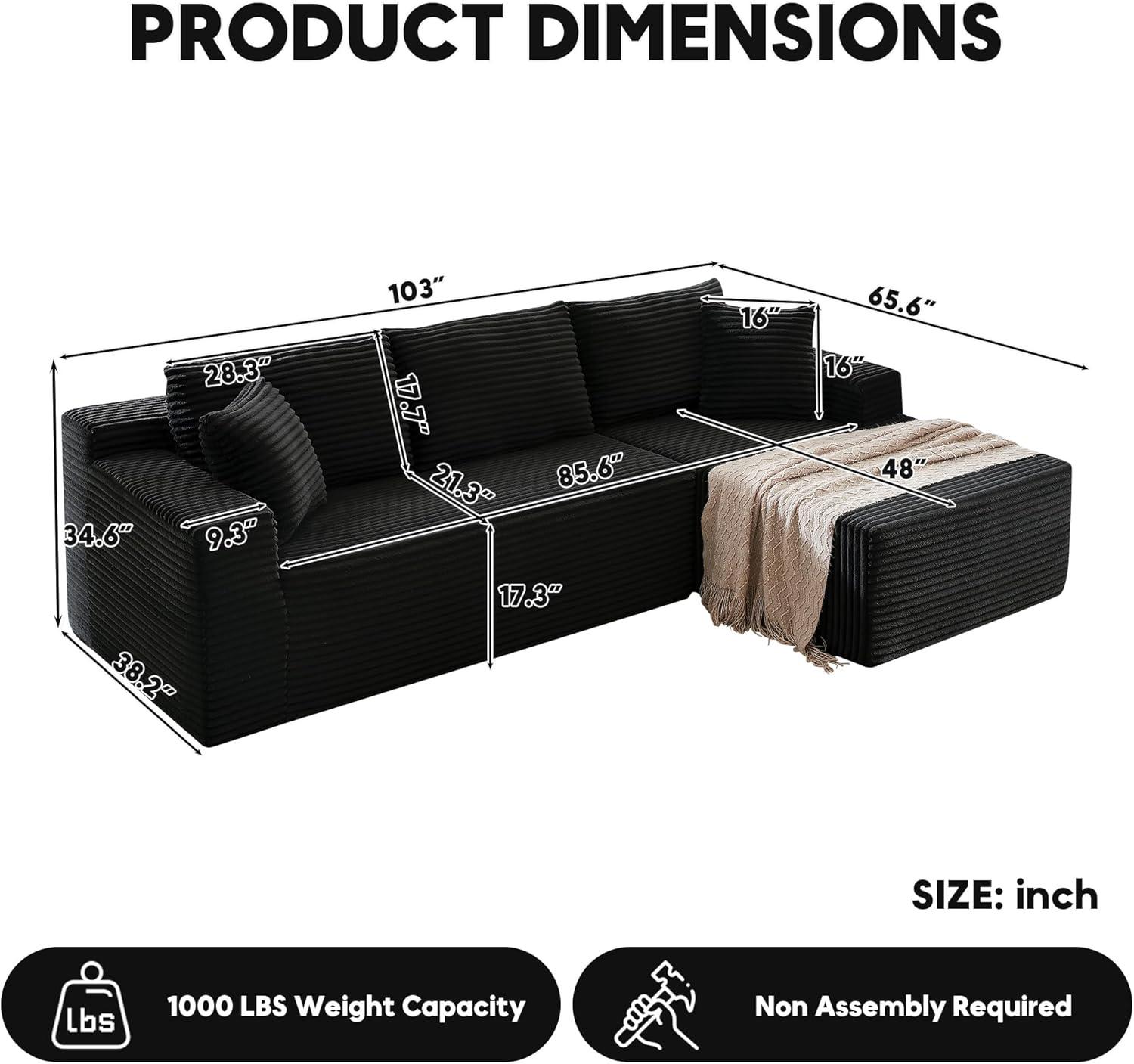 Right from the moment we unpacked this sectional, the luxurious corduroy fabric stood out—soft to the touch with a subtle sheen that beautifully complements any modern living area. The black hue adds a sleek, complex tone, while the boneless design invites us to sink into comfort without any rigid interruptions. The deep-seat chaise, measuring a generous 48 inches, proved instantly inviting for lounging or reading, thanks to its durable high-resilience foam core combined with coil spring construction. This build offers a cloud-like softness paired with steadfast support, making it a relaxing centerpiece for our living room gathering spot.