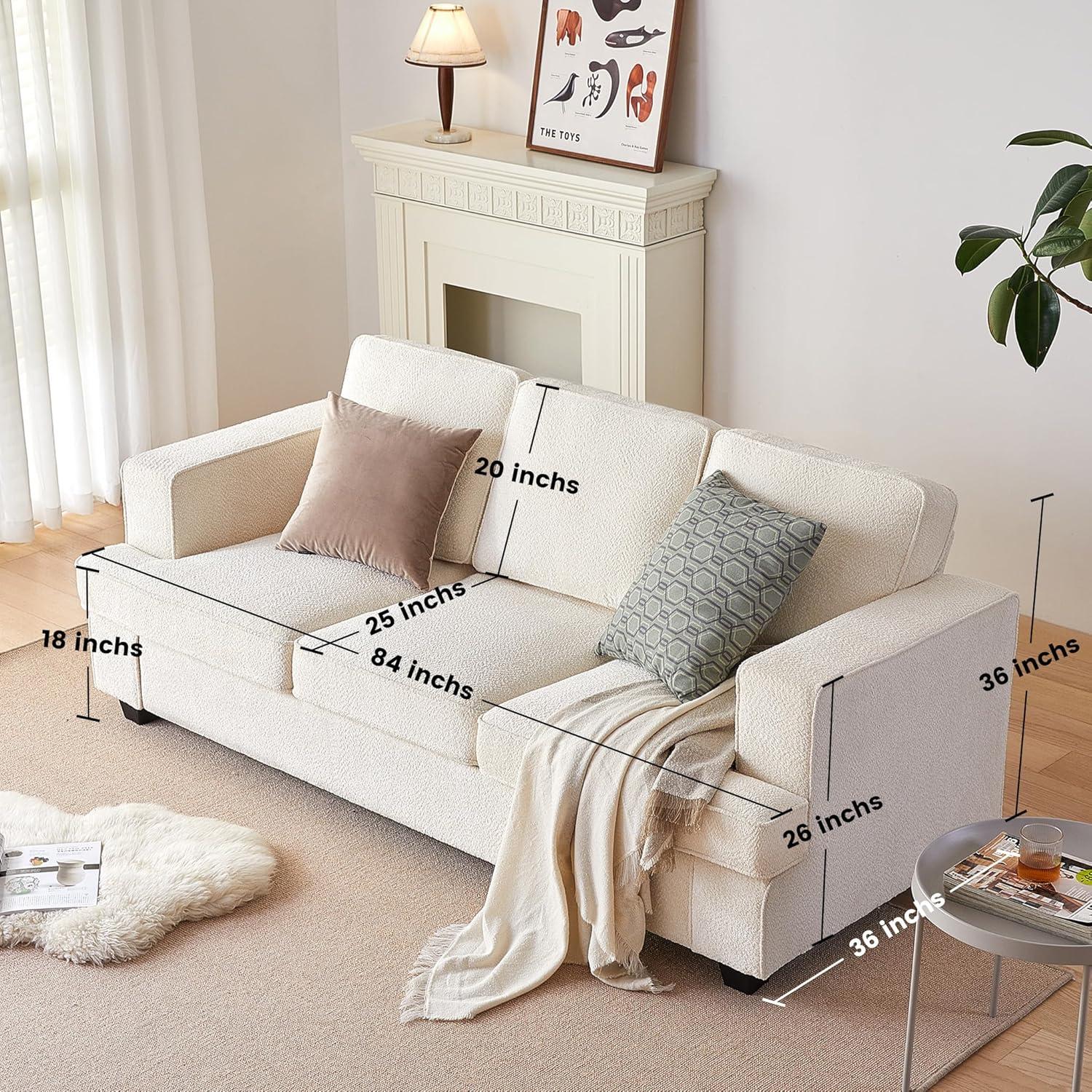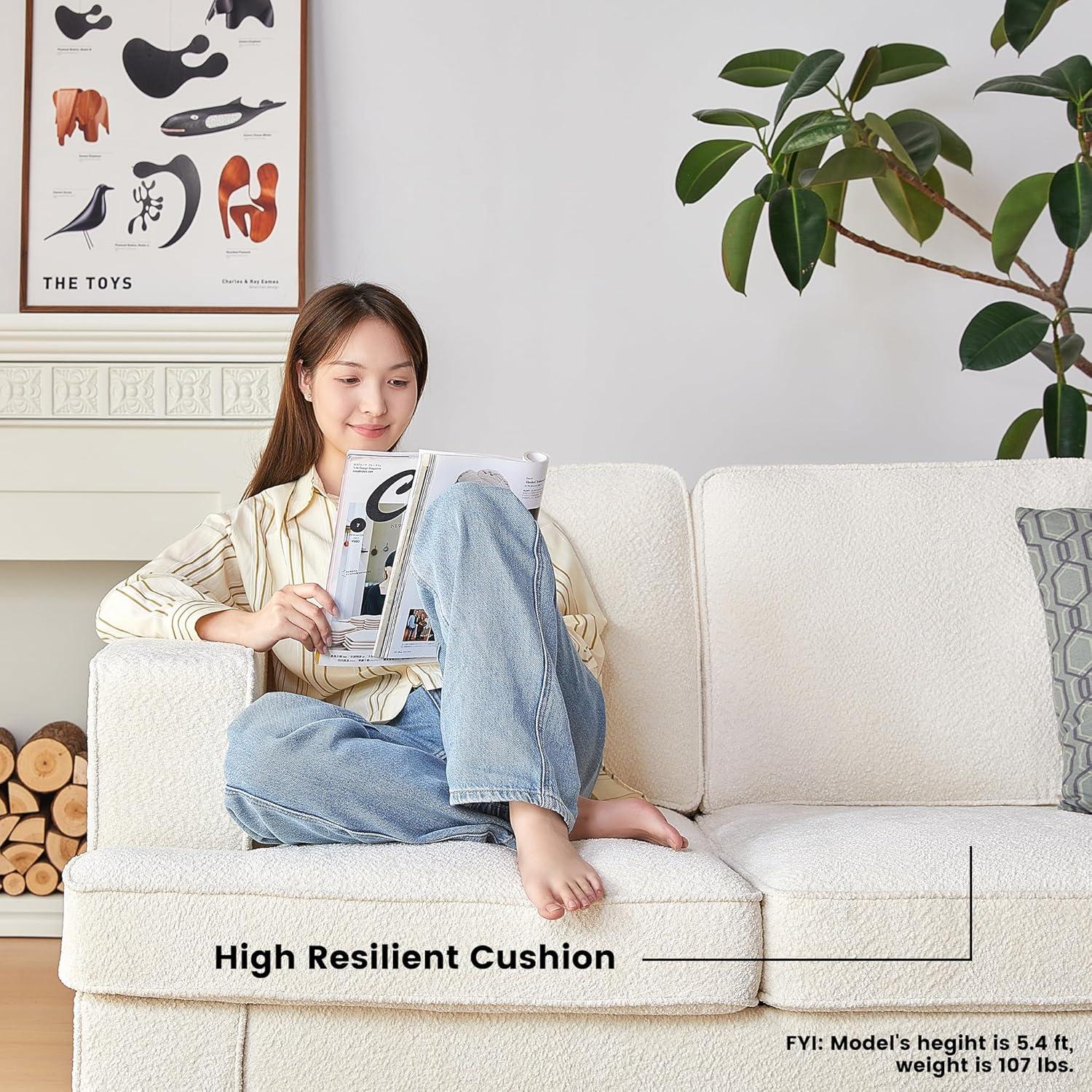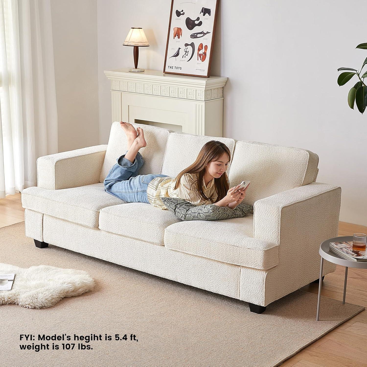 Our time with this modern, deep seat sofa has been mostly positive, especially considering its affordable price point.Assembly was straightforward and quick, allowing us to set it up without any hassle. The plush chenille fabric offers a pleasant tactile experience—many describe it as resembling the softness of sitting on a giant teddy bear, which adds a cozy, inviting feel to any room. We appreciated the thoughtfully designed 105-degree ergonomic backrest and the generous seat depth, which makes lounging or working from the couch pleasant for extended periods. Its compact size fits perfectly in smaller living spaces or offices without feeling cramped, while the warm white color and minimalist style blend effortlessly with various interior themes.