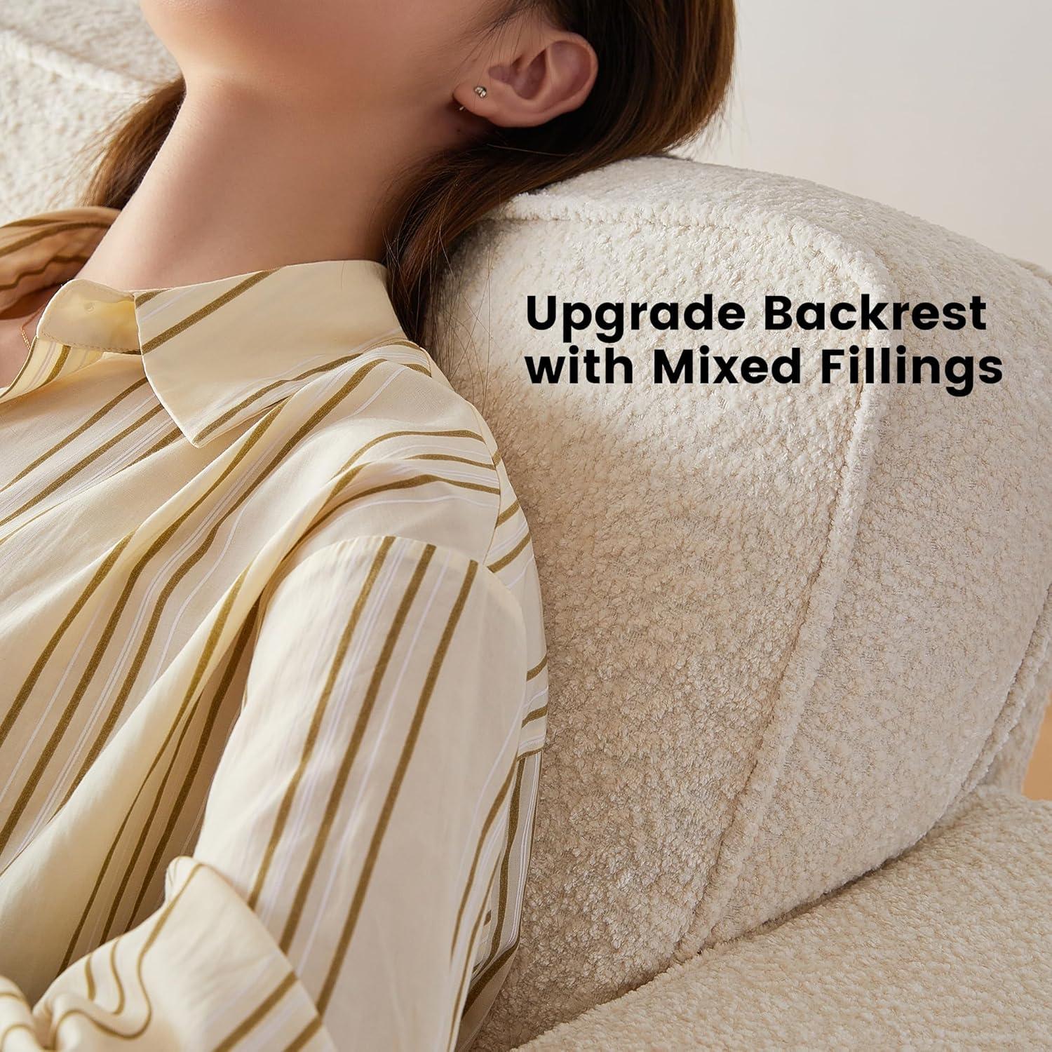 After spending time with this sofa, we believe it offers a compelling balance of style, comfort, and practicality—especially for those with limited space or looking for a modern yet cozy addition to their home or office. Its deep seats and ergonomic 105-degree backrest angle deliver excellent support, making it ideal for long lounging sessions. Assembly is straightforward, requiring minimal effort and no extra tools, which means you’ll relax sooner rather than later. The fluffy, warm-white chenille fabric adds an inviting texture that feels like sitting on a big teddy bear, even though some may find the cushions firmer than expected. it provides solid value for money considering its design, build quality, and comfort.