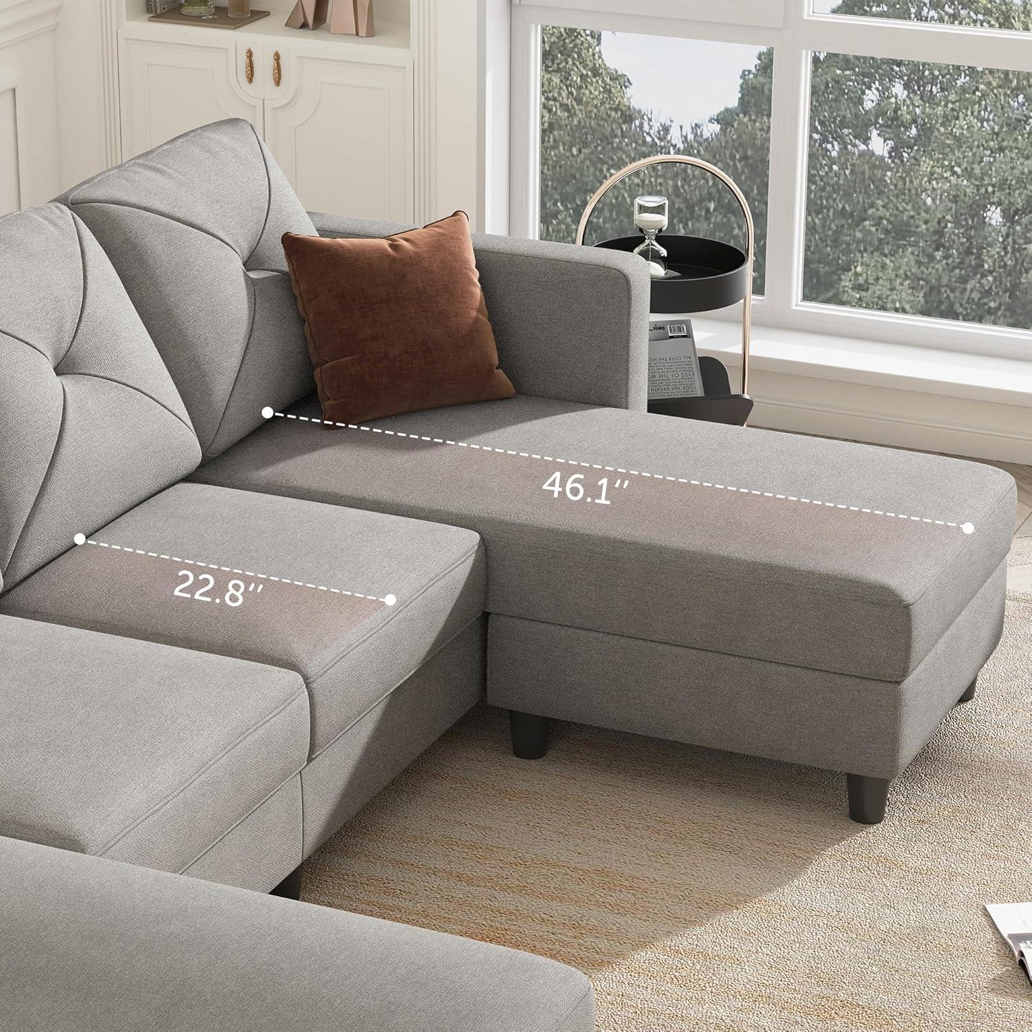 From daily lounging to occasional gatherings, the frame of this sectional has proven impressively sturdy and well-constructed. Crafted to hold up to 300 lbs per seat with a total capacity of 1800 lbs,the support feels reliable without any creaks or instability. The upholstery, a smooth light grey fabric, strikes a nice balance between durability and comfort, resisting common signs of wear such as pilling or fading even after consistent use. What stands out most is the thick, plush cushioning that maintains its shape and softness, making the sofa both inviting and supportive over long periods.