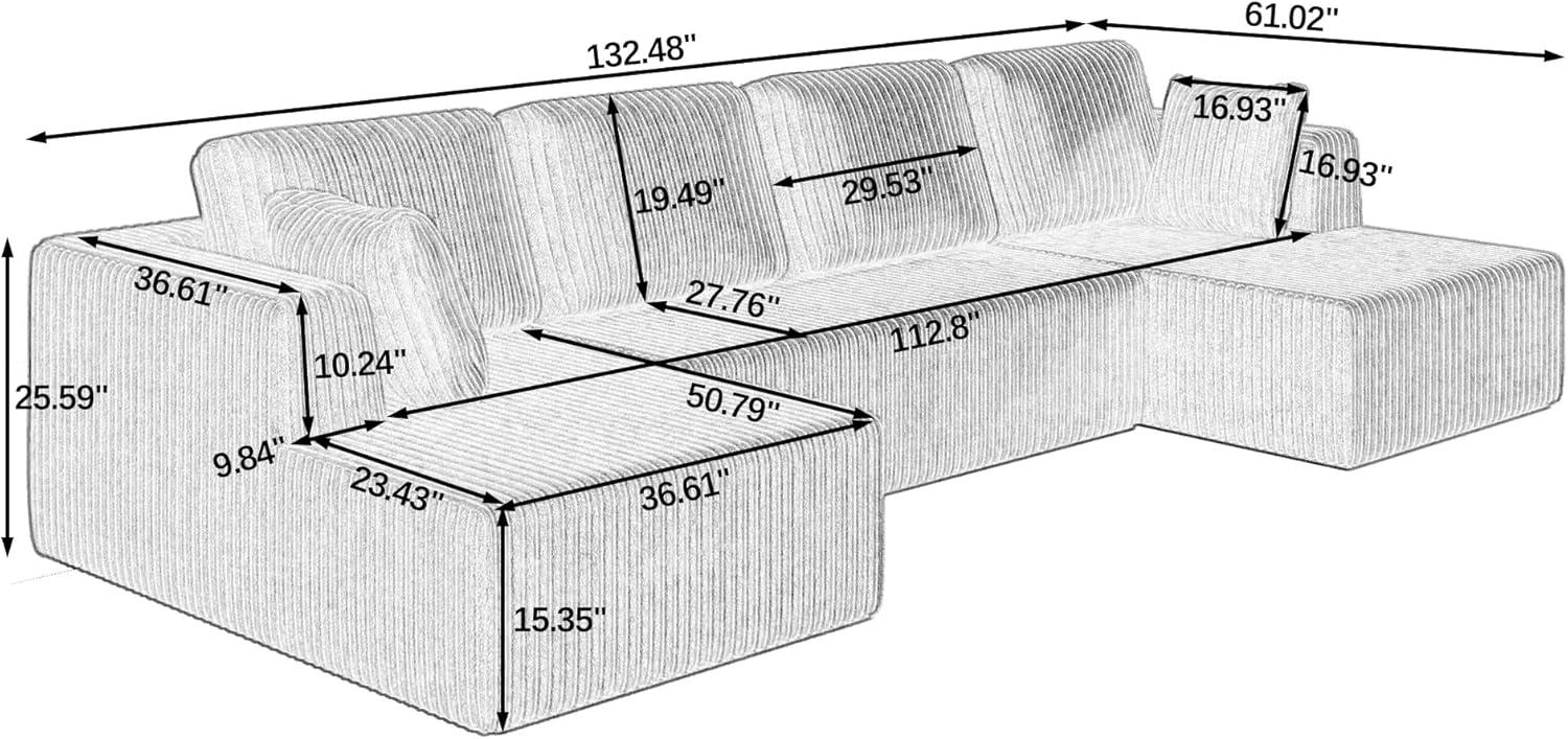One of the standout features of this modular sectional is its exceptional adaptability. Each piece functions both independently and as part of a cohesive U-shaped arrangement, allowing us to easily customize the layout to fit various room sizes and purposes.The straight-cut edges and minimalist design blend seamlessly with modern decor, while the soft corduroy fabric adds a subtle touch of texture and warmth. Whether arranged as a spacious loungy corner or separated into individual seating units, this sectional offers comfort and style without compromise.