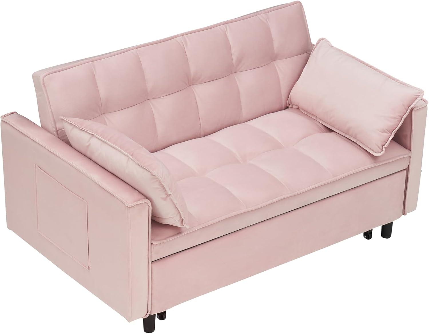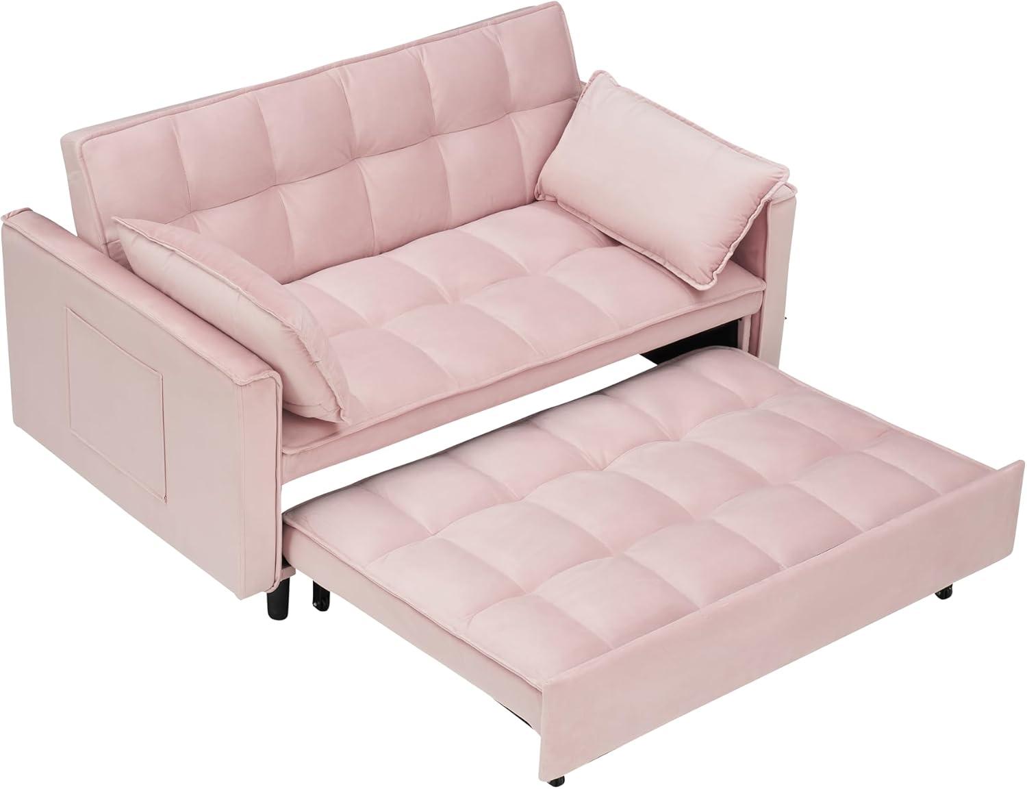 Sunlight skims the velvet and the tufted back catches it in little bands; you run a palm over the short pile and feel that restrained, slightly velvety nap. The Eafurn 3 in 1 Multi-function Pull Out Sofa Couch — the 3‑in‑1 loveseat here — sits about the width you’d expect from a loveseat, low to the floor with squat legs that keep its visual weight modest. From across the room you notice the tailored seams and the tucked buttons, and up close the seat gives with a springy, foam-y resistance that suggests more bounce than sink. You also notice a fabric pocket at the side and a tidy pull-out rail that glides out smoothly, changing the sofa’s silhouette without drama.