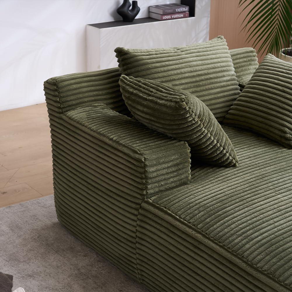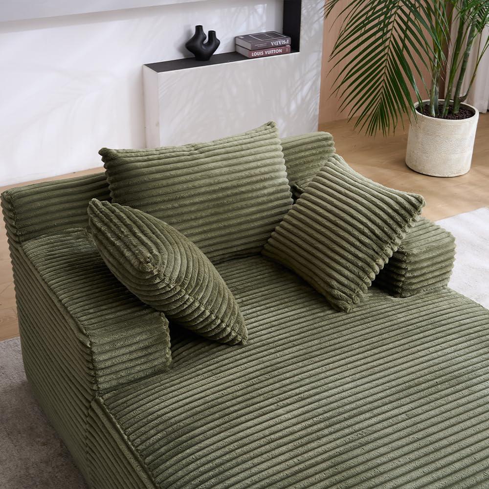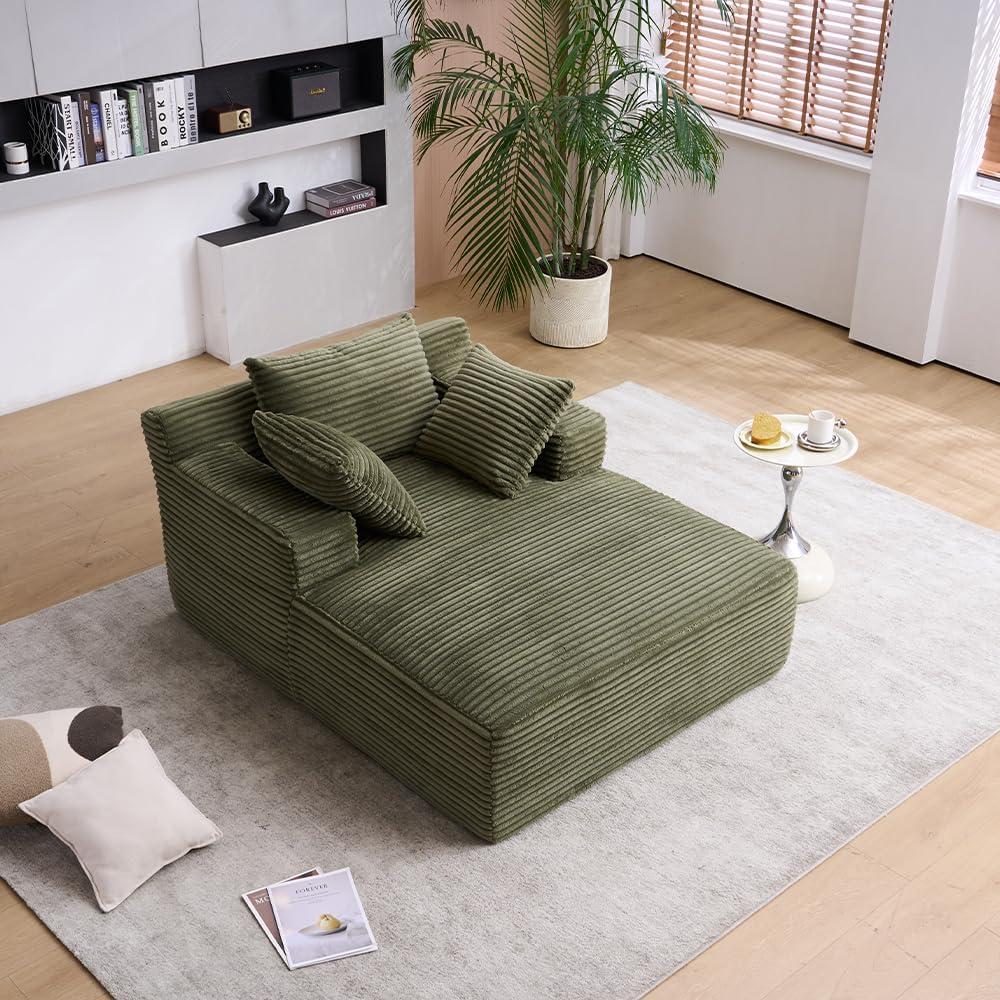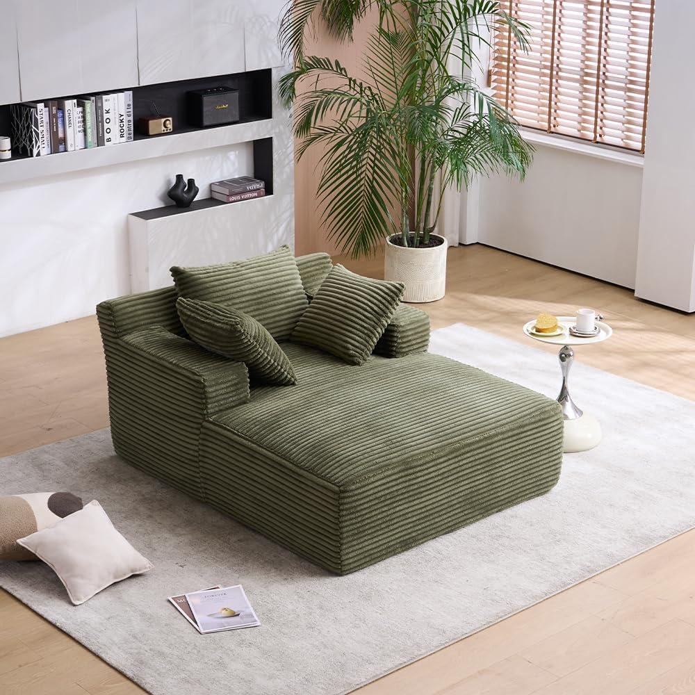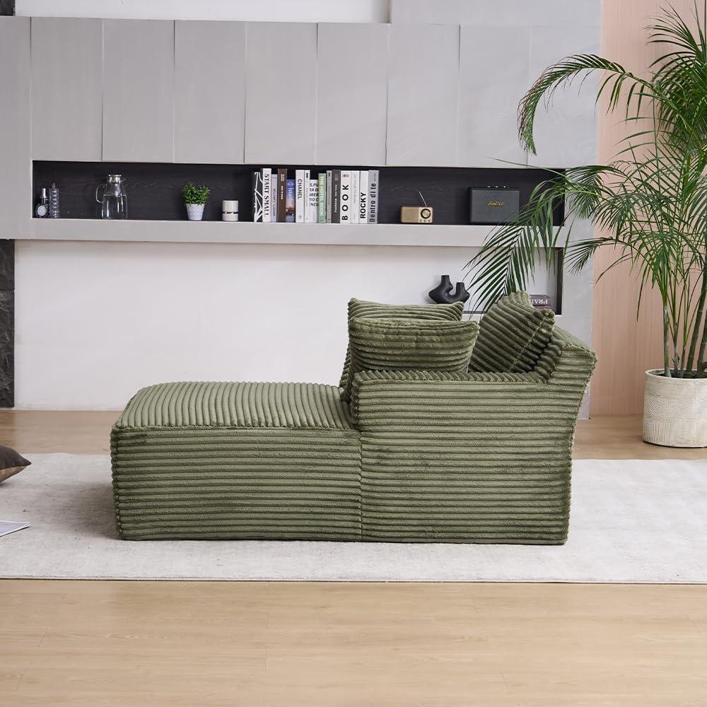 Light catches the corduroy ribs and lays a soft stripe across the surface; you run a palm over it and feel the plush, slightly ridged texture. eafurn’s 49″ Full Foam Oversized Chaise Lounge Chair — the Cozy Cloud chaise, for short — sits with a low, broad silhouette that quietly changes the room’s balance. You sink into a surprisingly deep seat that yields frist and then holds, while a wide armrest reads more like a small ledge than a support. Three throw pillows slump into place, making the piece look already settled into a rhythm of use. From across the living space it anchors the view; up close the dense foam and corduroy finish reveal themselves in tactile, everyday detail.