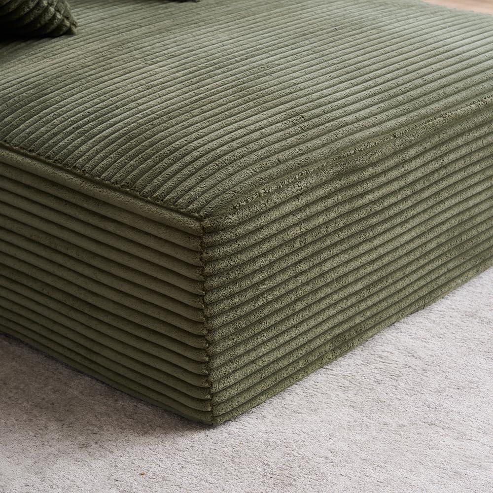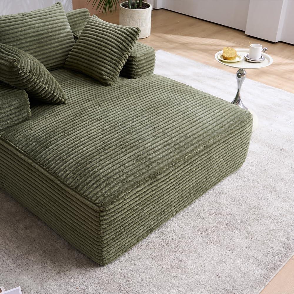 In day-to-day use the chaise tends to behave like a casual, sink-in seating piece rather than a firm, upright sofa. When occupied for TV marathons or naps the seat compresses and the corduroy surface shows soft paths where bodies have settled; pillows are frequently nudged back into place and seams shift a little as people stretch out. Short bursts of activity — reading, scrolling on a phone, reaching for a remote — produce small surface wrinkles and the habit of smoothing the fabric afterward. Over time,the foam gives a lived-in contour rather than a taut plane,and that contour is what most routines settle into.