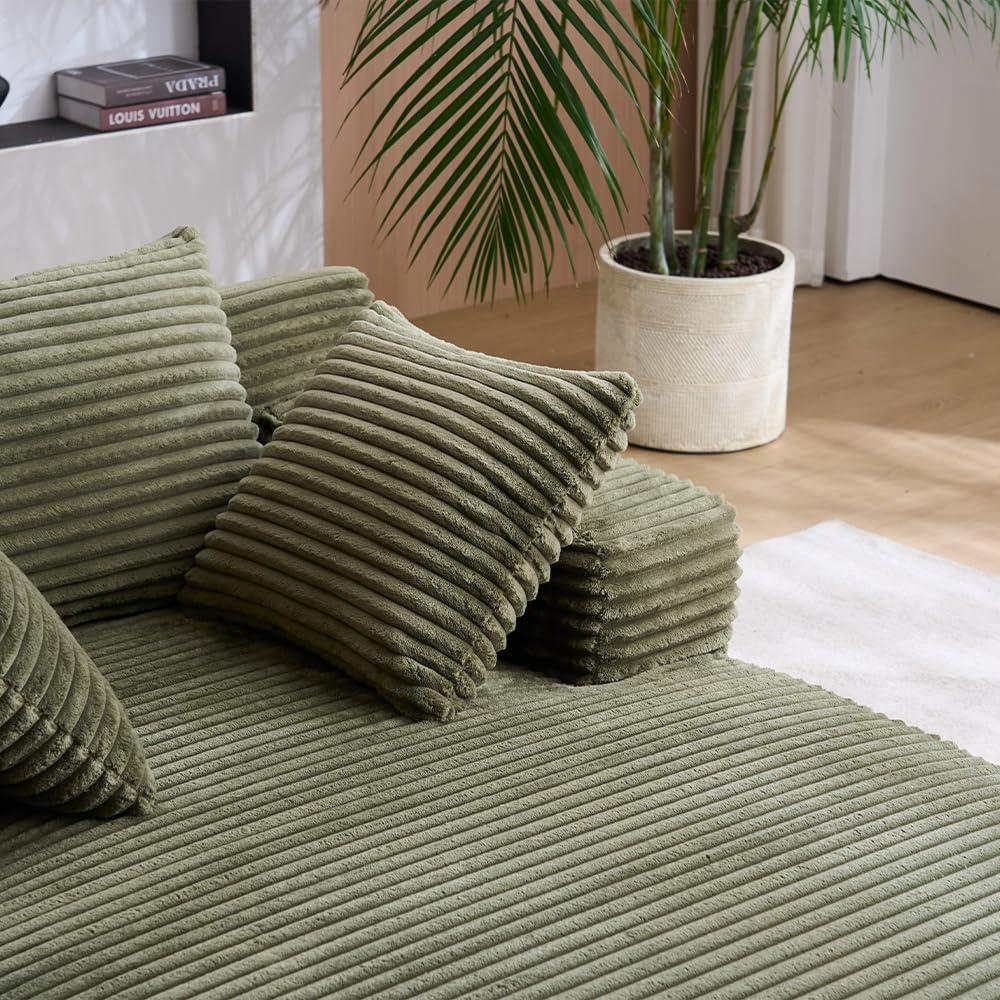 When you enter the room, the plush corduroy immediately reads as a surface that changes with movement. The soft ribs catch light at different angles, so a spot you smooth with your hand one minute will show faint shadowed grooves the next, especially where you lean or sit. As you settle, the foam underneath compresses and the fabric’s texture compresses with it; seams and cushion edges settle into shallow creases that trace habitual positions. From a distance those subtle variations add depth to the silhouette, and up close the ridged pattern gives the upholstery a tactile presence that invites a reach but mostly signals where the body has been.