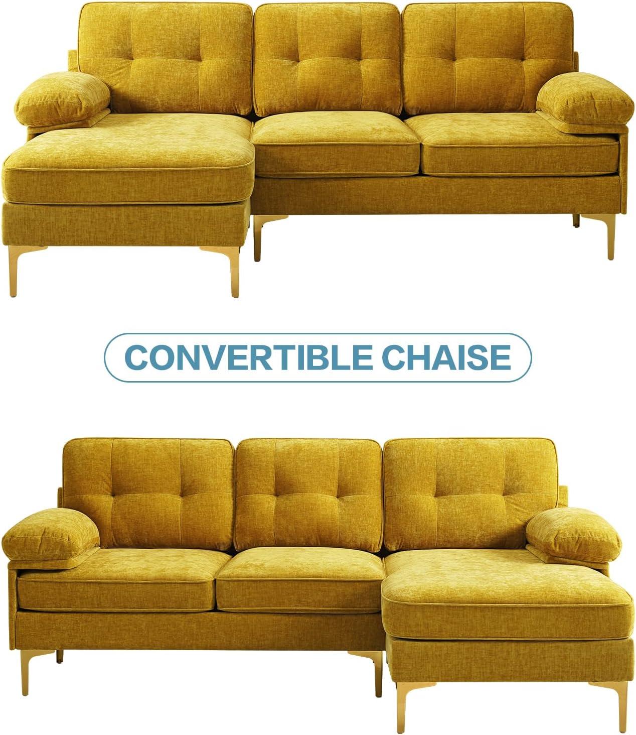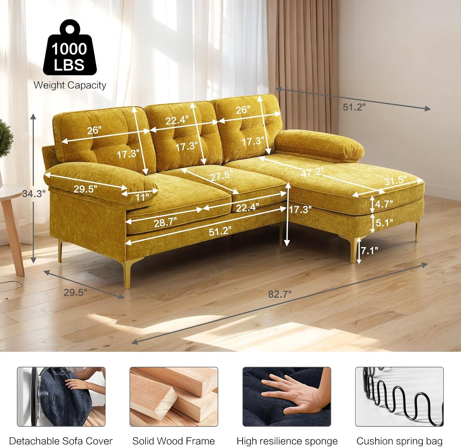 Fitting this sectional into our apartment was surprisingly seamless. Its 82.7″ width and 51.2″ depth meant it didn’t overwhelm the room but still provided enough seating for family and guests.Since the chaise lounge is reversible,we easily flipped it to match the available corner,maximizing flow without rearranging other furniture. The modern chenille fabric in vibrant yellow instantly brightened the space, adding a cheerful yet elegant vibe without clashing with our existing decor. Assembly was straightforward with clear instructions, and the solid wood frame combined with iron pipe supports gave us confidence in its durability for everyday use.
