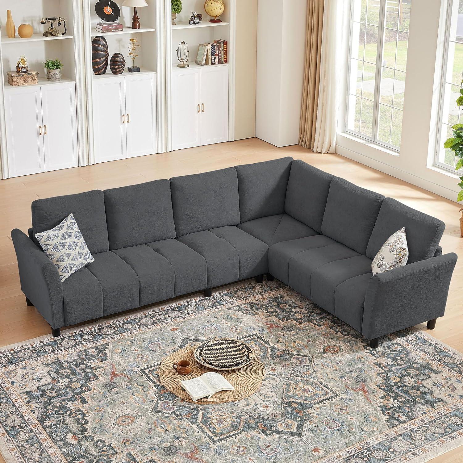 Light skims the deep gray upholstery and you notice the sofa before you sit: a broad, low silhouette that anchors the room without shouting. Up close the weave feels a little toothy under your hand, the cushions offering a measured, firm give rather than a soft collapse. The ottoman lines up precisely with the main run and a dark wood base adds a visual heft that keeps the piece from floating. After you assemble the Enobala L Shaped Couch Modern Sectional Sofa, the taller back cushions catch your shoulder in a way that subtly changes how you settle in, and the whole arrangement quietly alters the room’s flow as daylight shifts.