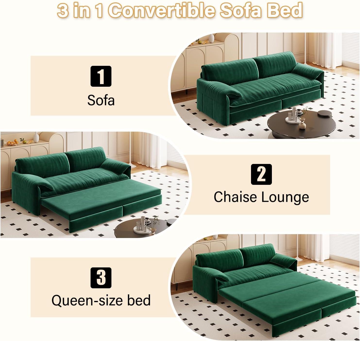 This 3-in-1 multifunctional piece truly transforms our living area by combining the benefits of a loveseat, chaise lounge, and queen-size pull-out sleeper in one oversized design. Crafted with a robust metal and plywood frame, it supports up to 750 lbs, ensuring sturdy reliability.The velvet upholstery not only adds a touch of elegance but is also soft, breathable, and durable for both sitting and sleeping. Practical features such as a removable backrest, cushion covers, and soft armrests enhance its versatility, making it a perfect fit for both home and office environments.