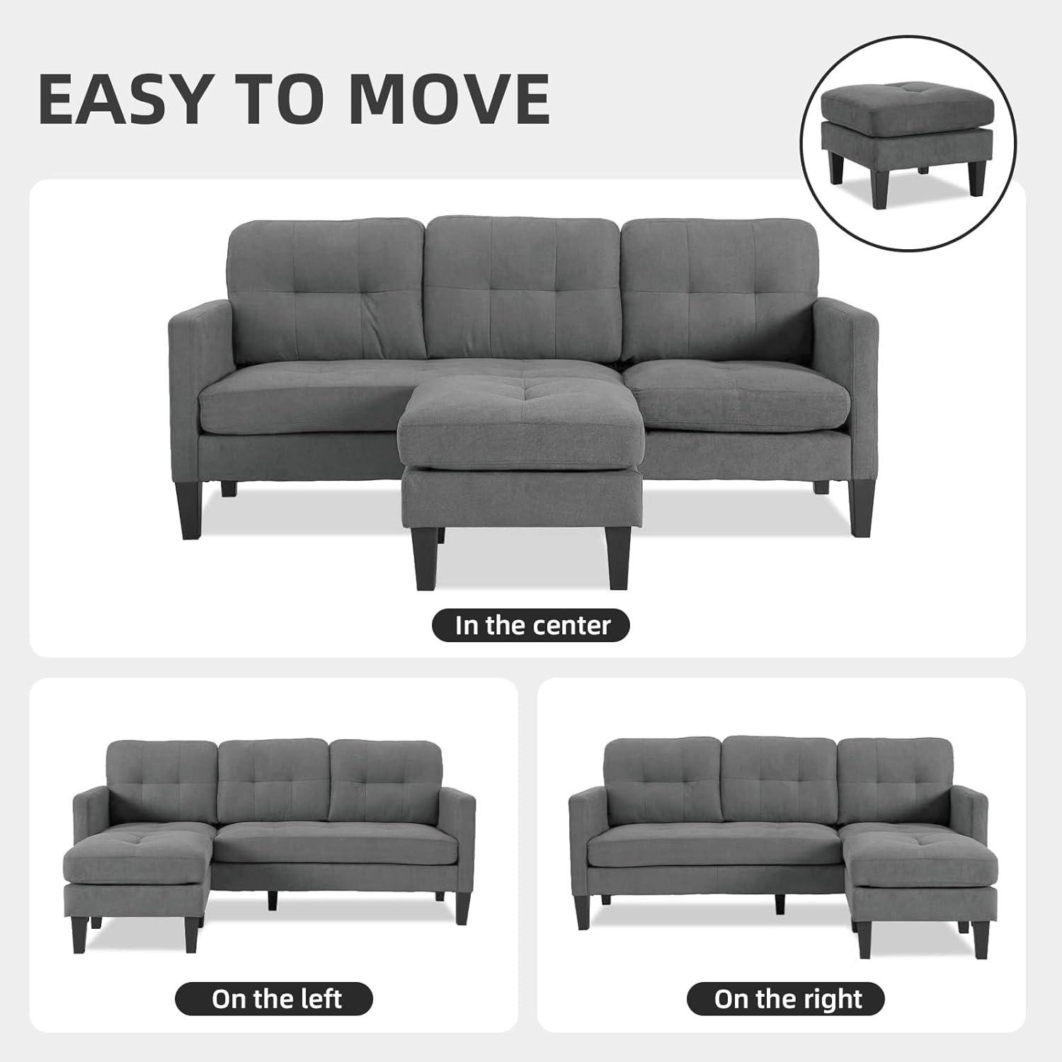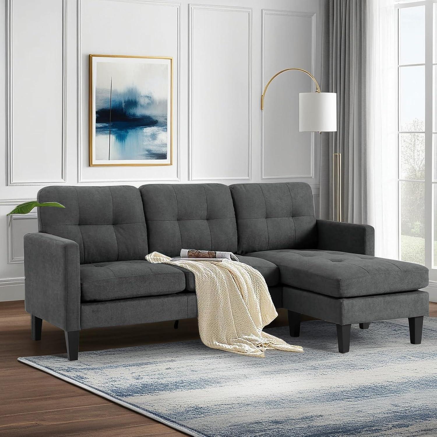 This sectional couch stands out with its sleek, modern design tailored for both style and practicality, making it ideal for apartments and small living rooms.Featuring a reversible chaise, it offers astonishing versatility, allowing us to customize the layout to perfectly suit our space.The dark gray fabric upholstery lends a sophisticated, neutral touch that effortlessly complements various interior styles, while the boneless design adds to its contemporary charm.