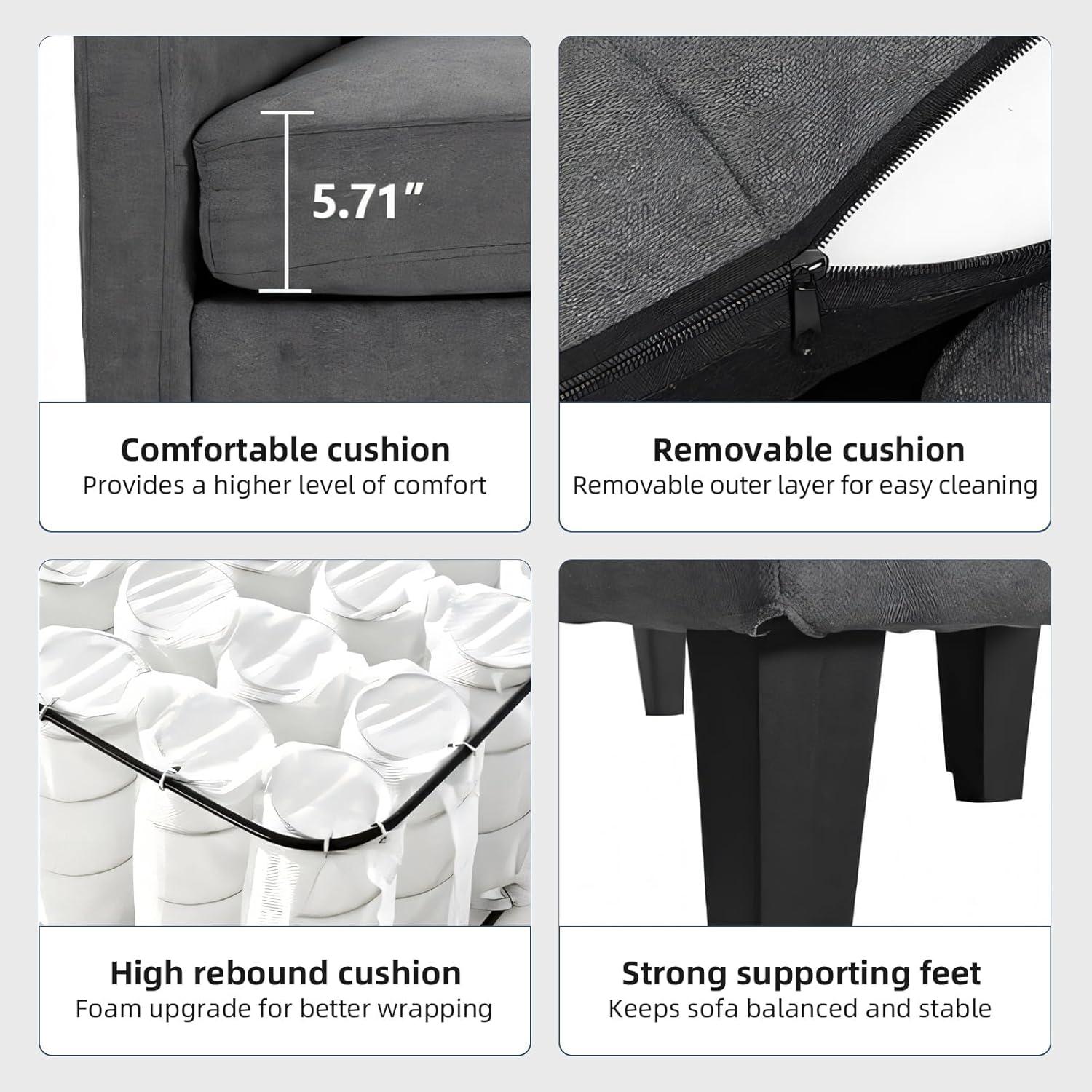The plush high-density foam cushions wrapped in soft fabric deliver a truly cozy seating experience. The reversible chaise adds versatility, letting us customize the setup to fit our room’s layout perfectly. Maintenance is simple, too, as the removable covers can be easily unzipped and washed, keeping the couch looking fresh without much effort. It’s a smart, practical choice for smaller spaces, combining comfort and functionality without overwhelming the room.