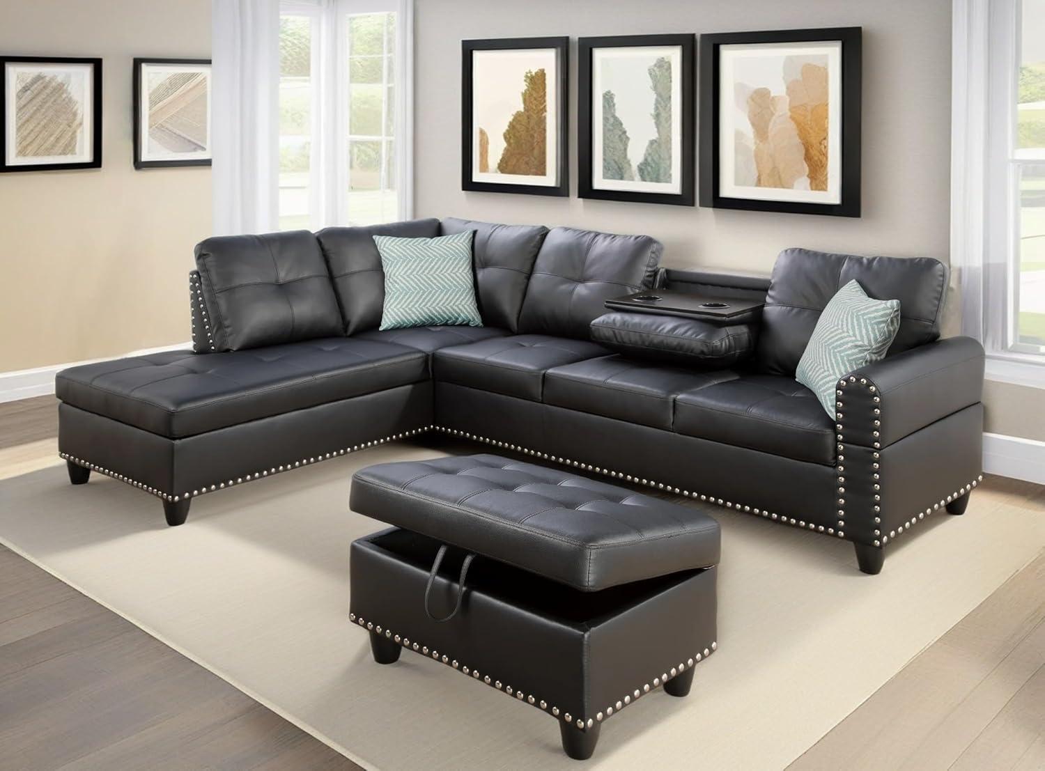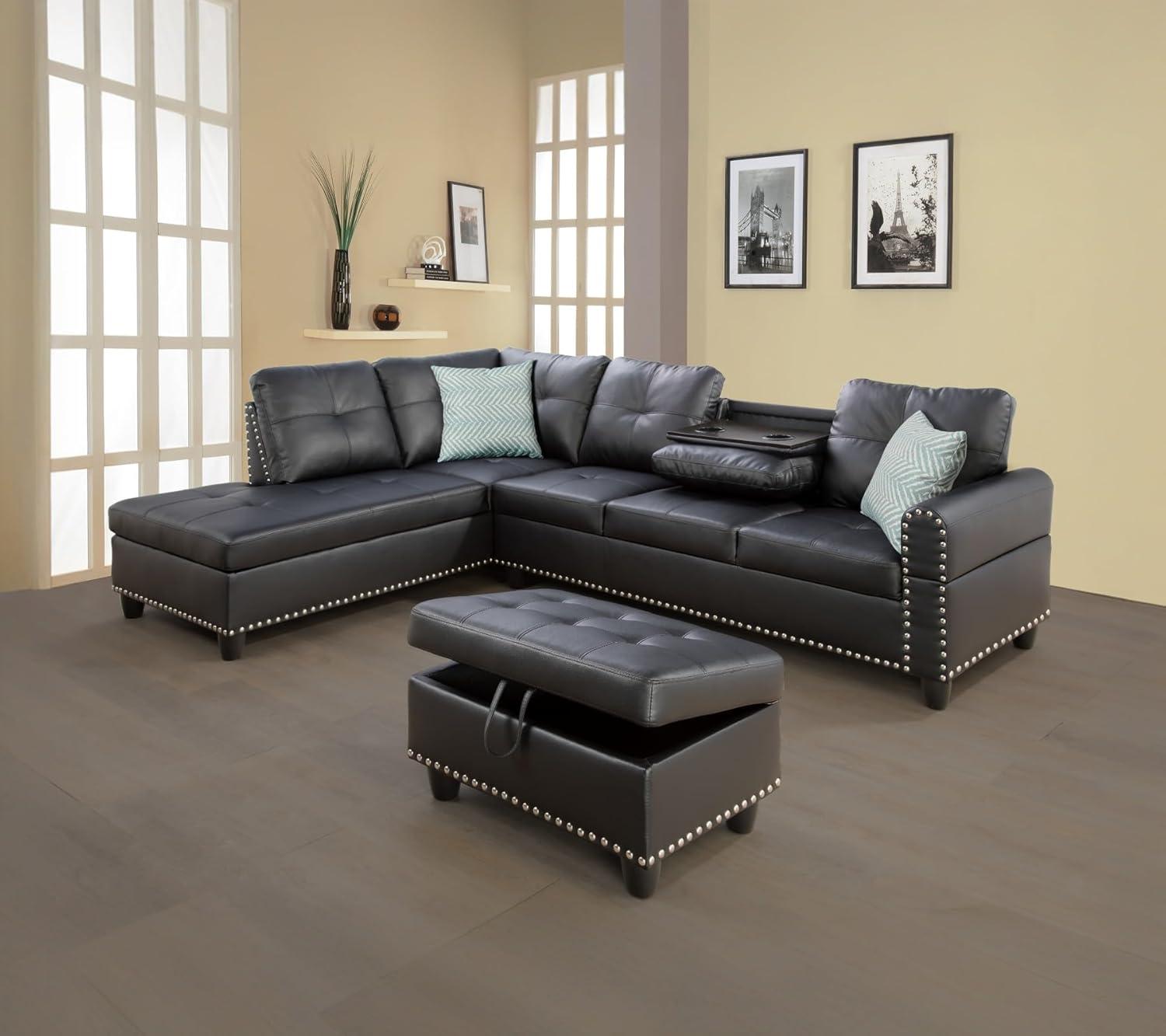The storage ottoman is a standout feature that greatly enhances the practicality of this sectional. Its spacious interior provides the perfect spot to tuck away blankets, magazines, or remote controls, keeping our living area neat and organized without sacrificing style. the ottoman’s sturdy construction ensures it can double as extra seating or a footrest with ease. Covered in the same faux leather as the sofa, it blends seamlessly with the overall aesthetic, making it both a functional and visually appealing piece.