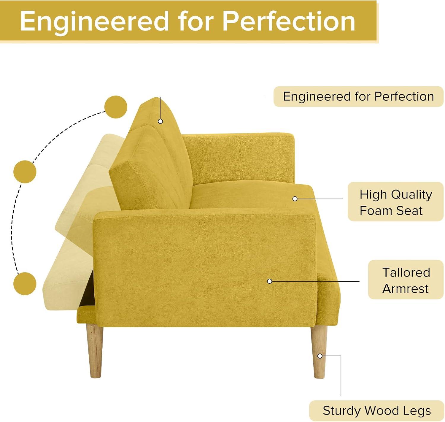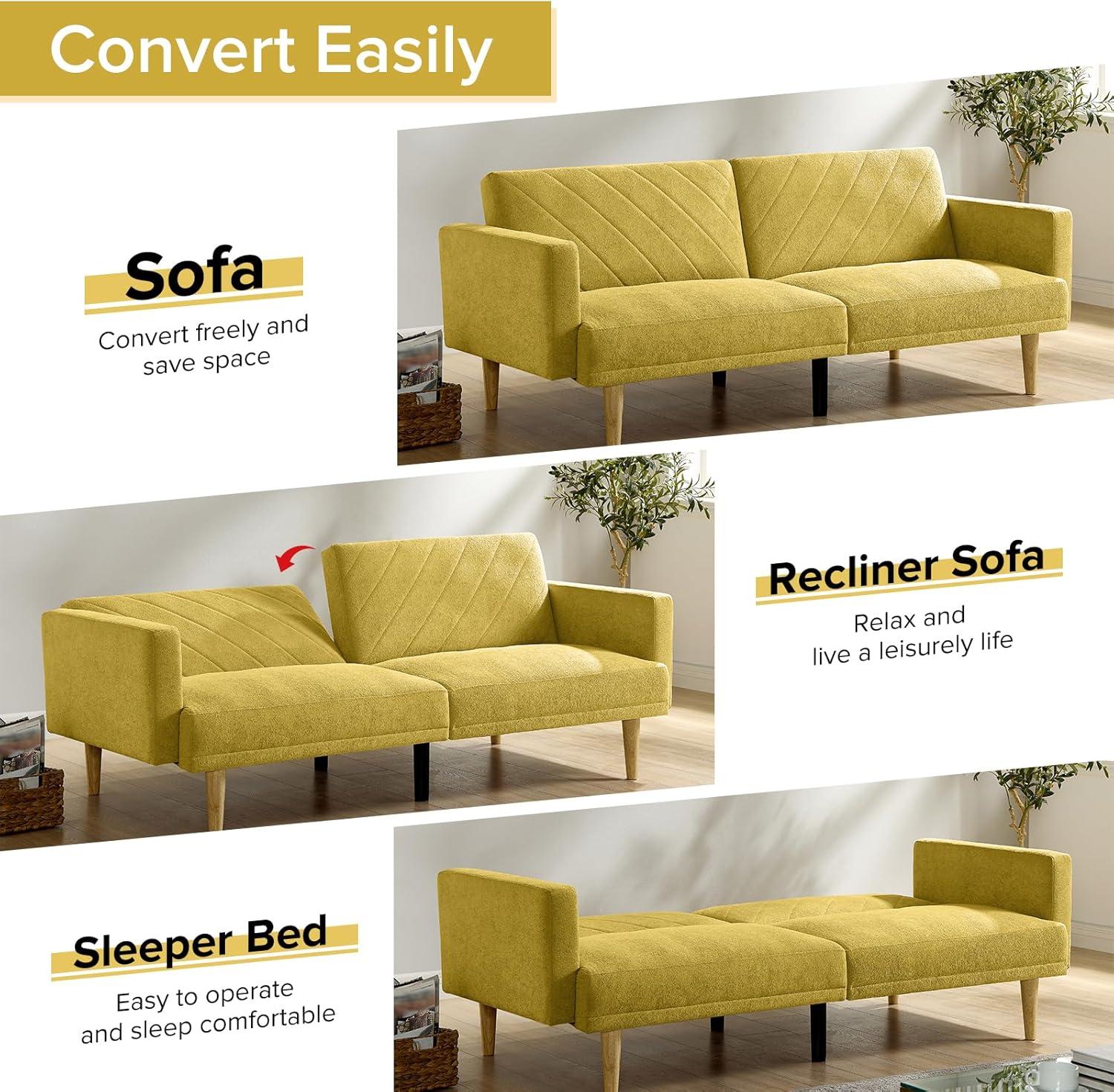 After thoroughly testing this compact futon,we appreciate how effortlessly it balances style,comfort,and functionality. Its multi-angle reclining backrest offers versatility—from an upright position perfect for work or family TV time, to a fully flat setup that transforms the seating into a cozy single bed for guests. The deep seat invites you to relax and unwind, while the upholstered armrests add an extra touch of comfort. Thanks to its compact footprint and elegant tapered wooden legs, this piece fits beautifully in small apartments, bedrooms, or home offices without overwhelming the space.