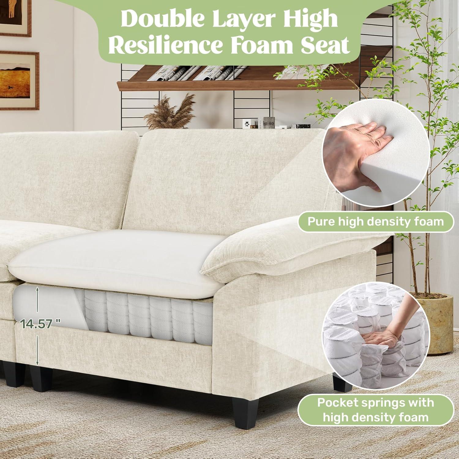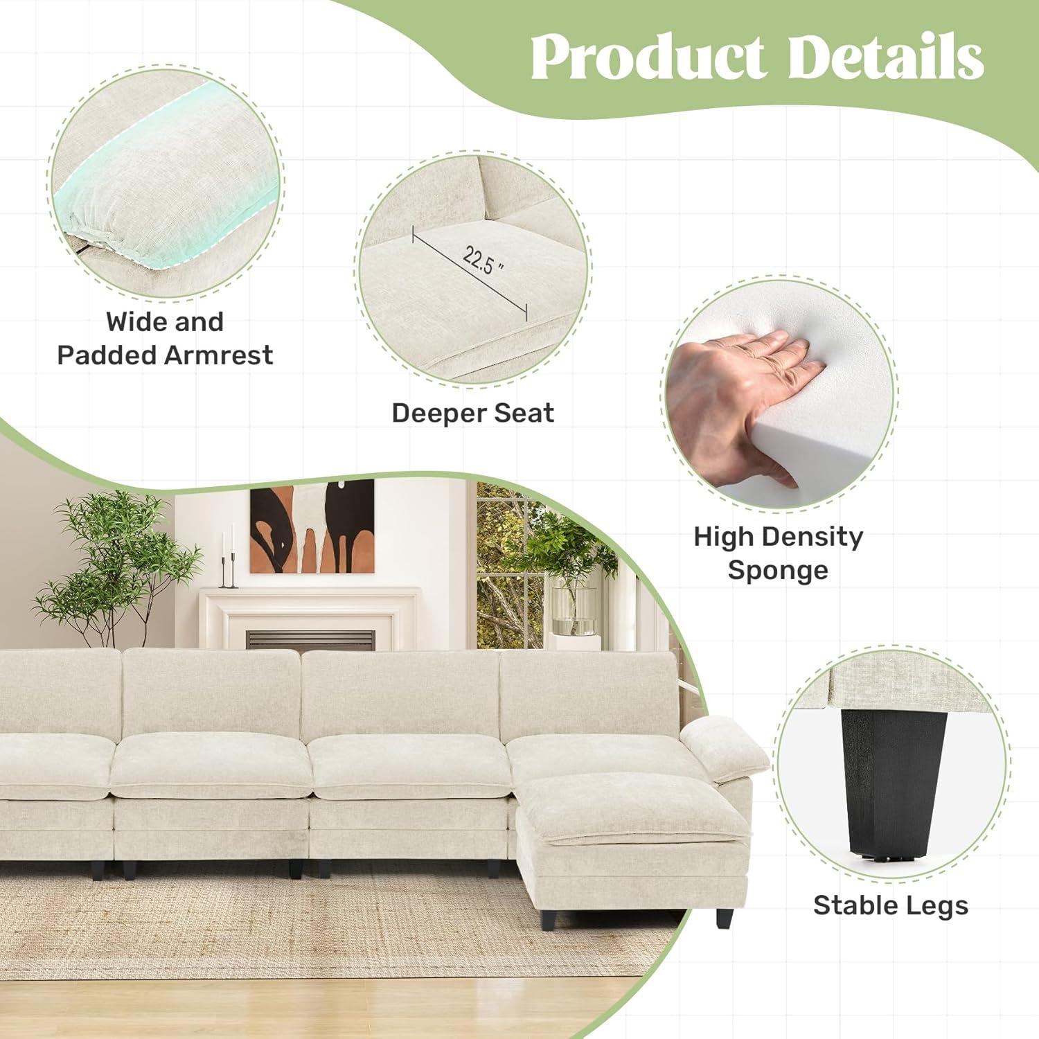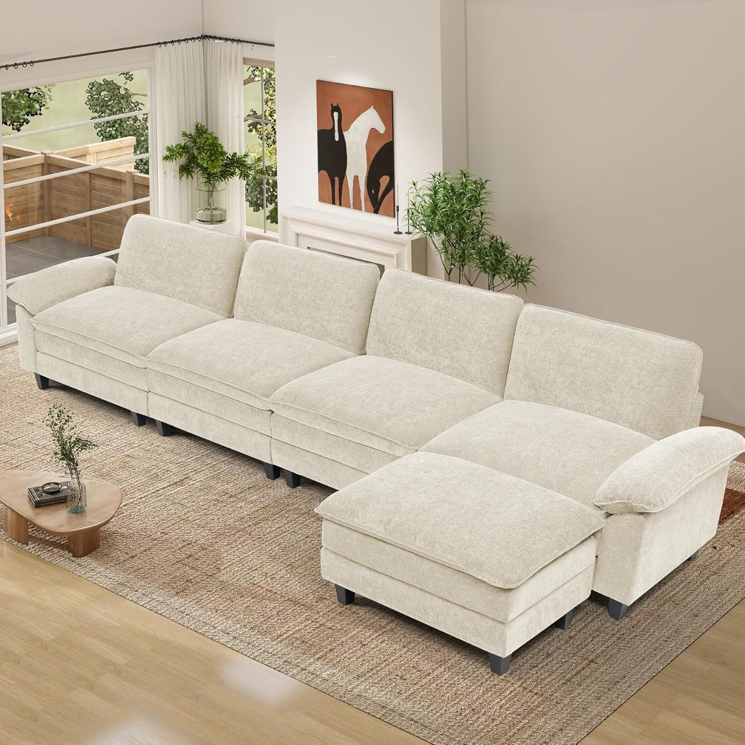 You run your hand across the chenille and the beige nap gives under your palm, a soft, tactile welcome that catches the afternoon light. After wrestling the pieces into place, the Luxanimarion 154-inch modular sectional reads as a low, generous presence—deep, wide seats that invite a backward collapse and an ottoman that feels like an extension of the same cloud. Up close the cushions are plush and the fabric has a subtle texture,while the backs sit a little flatter,so the silhouette is cushy at the seat but calmer from behind. From across the room the neutral color and clean lines quiet the space; nearer, the seams, zippers and short legs reveal the sofa’s practical, assembled nature.