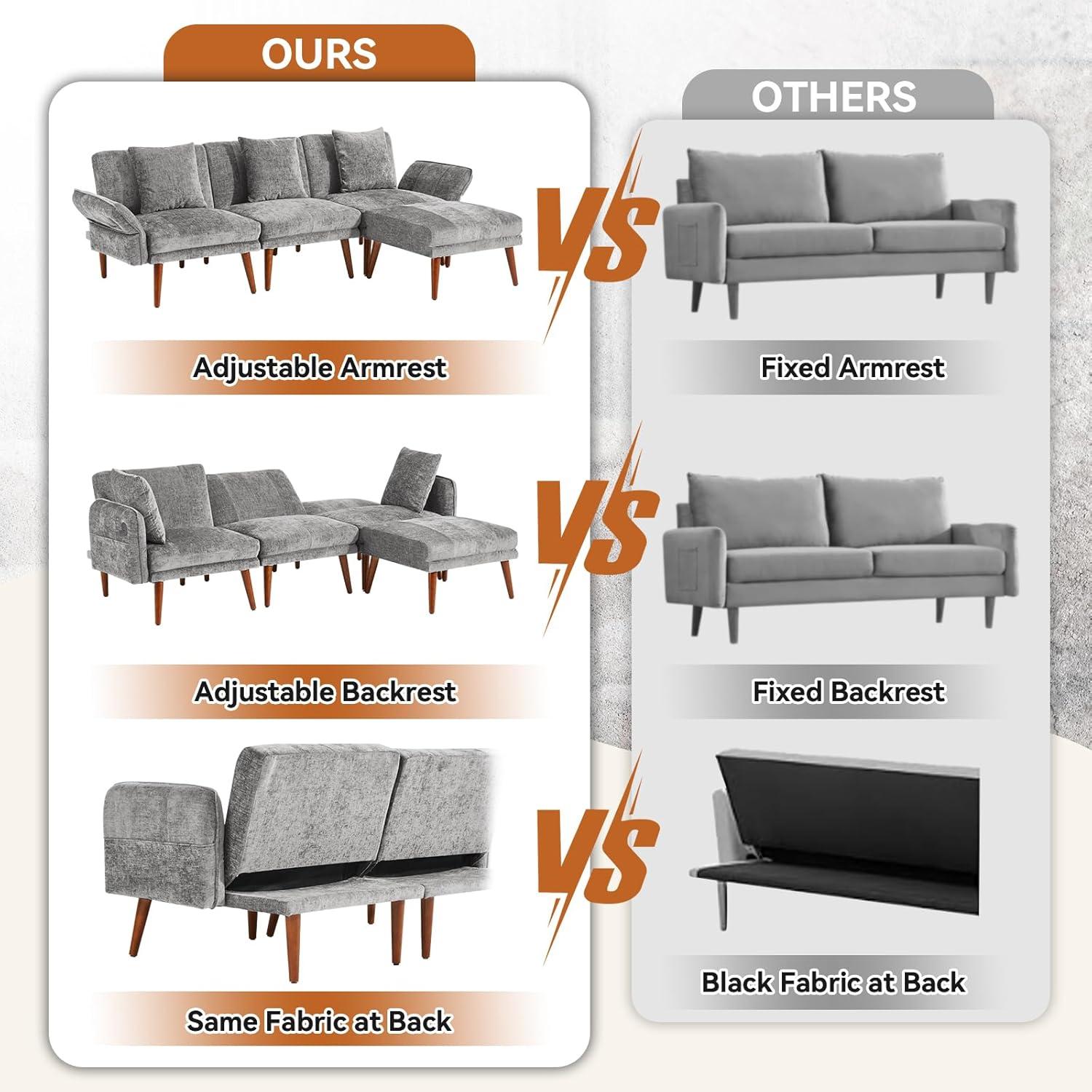 Comfort and customization are at the heart of its practical design. The backrest adjusts to multiple angles, including a complete 180° flat position for restful naps or overnight stays, while the armrests offer six different levels of adjustment, doubling as cushioned pillows.Constructed with durable chenille fabric and soft 28D sponge padding, it provides lasting support and a plush seating experience. Adjustable feet enhance stability and allow us to fine-tune the sofa height for uneven floors or preferred seating posture. Altogether, this piece fits perfectly into a variety of settings, delivering both adaptability and style exactly where we need it.
