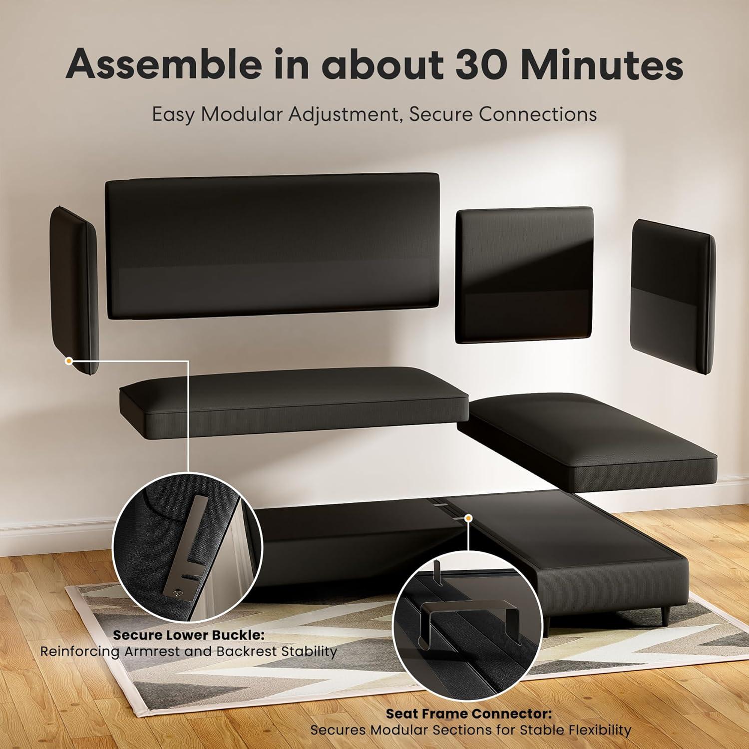 The clever 4-in-1 design is another standout, allowing us to switch effortlessly between configurations—a left or right chaise, a snug sleeper for midday naps, or a full 4-seater setup. This flexibility makes it an ideal fit for apartments, dorms, or any small living area. Not to mention, the 5.1” high legs facilitate robot vacuum cleaning underneath, blending smart convenience with minimalist design. Assembly is a breeze with the one-box delivery, and while the cushions take some time to fully decompress, a gentle pat helps speed up the process.