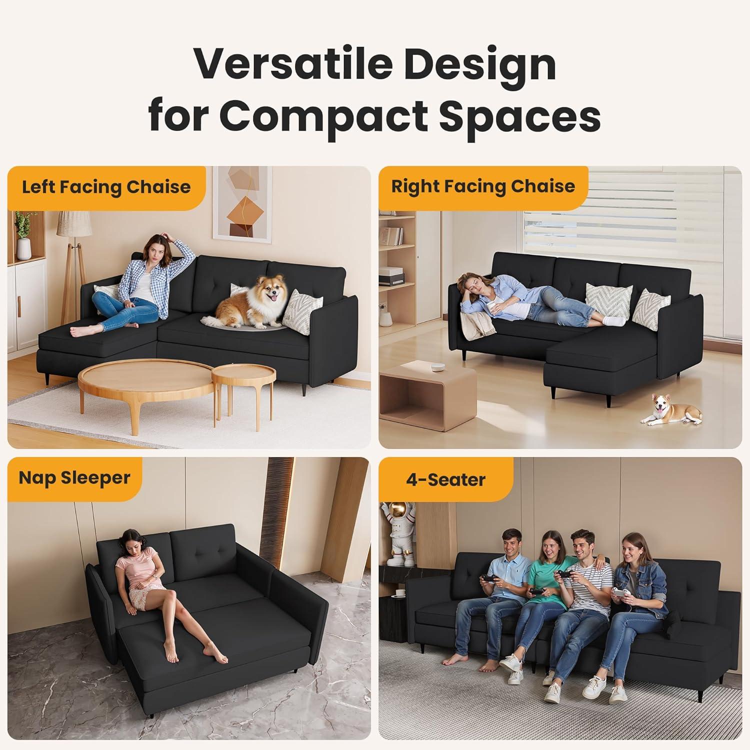 - Flexible configurations: Switch between left/right chaise, sleeper sofa, or 4-seater