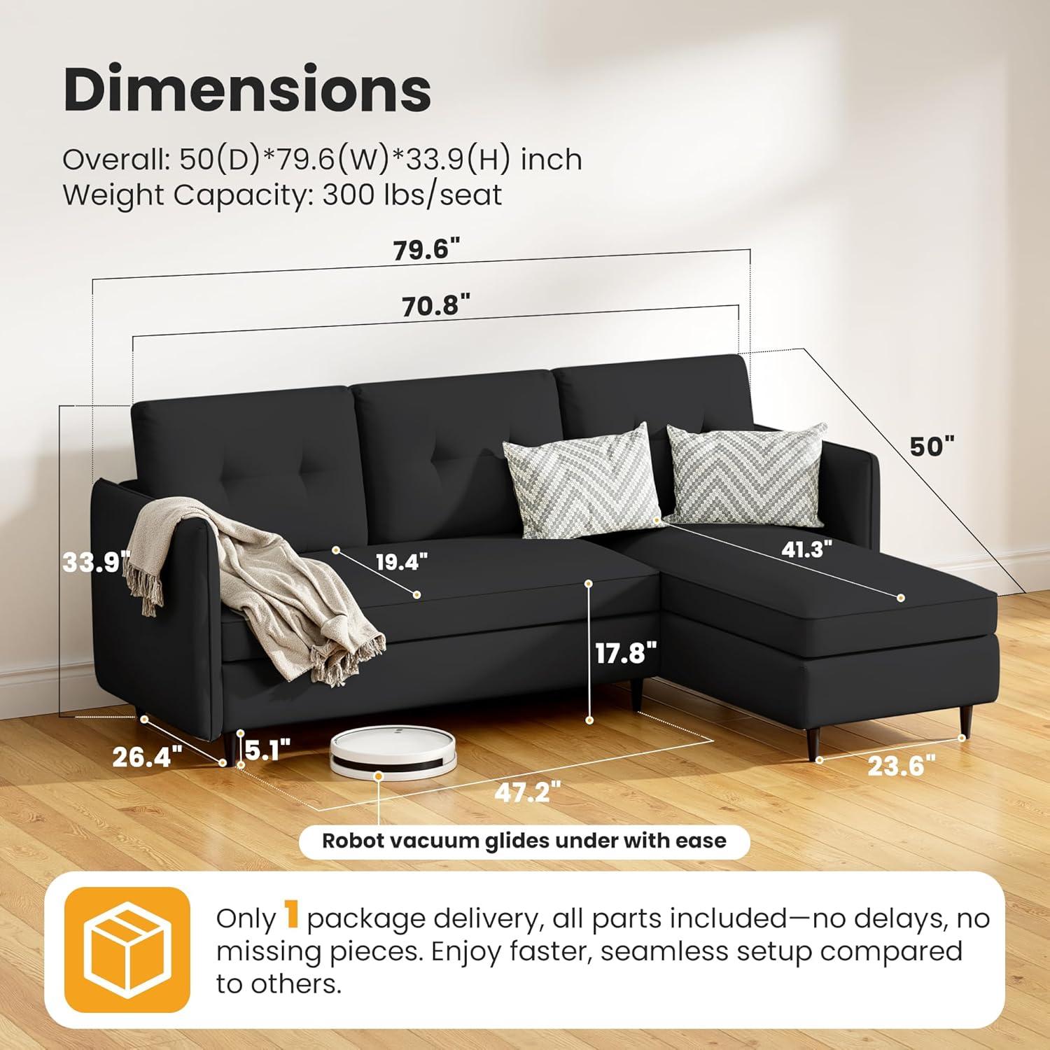 Right out of the box,this compact sectional made a strong impression with its versatile design and thoughtful features tailored for tight living spaces.The reversible chaise not onyl maximizes seating options but also doubles as a spacious storage compartment—perfect for stashing blankets, books, or everyday clutter. Its dimensions (50”D x 79.6”W x 33.9”H) fit snugly in apartments, dorm rooms, or cozy living areas without overwhelming the space. We appreciated the lightweight yet sturdy construction that supports up to 300 pounds per seat, maintaining comfort without sacrificing durability.