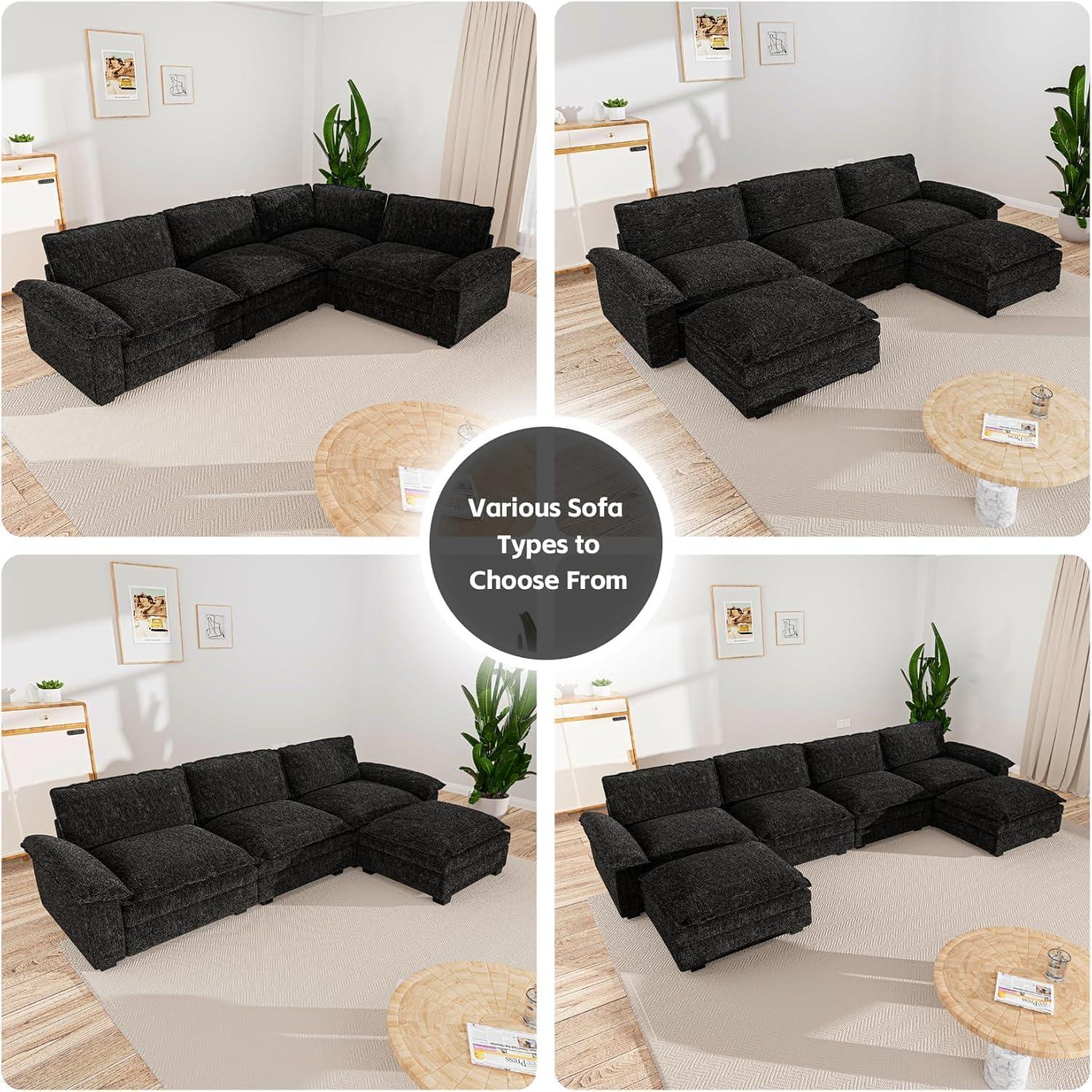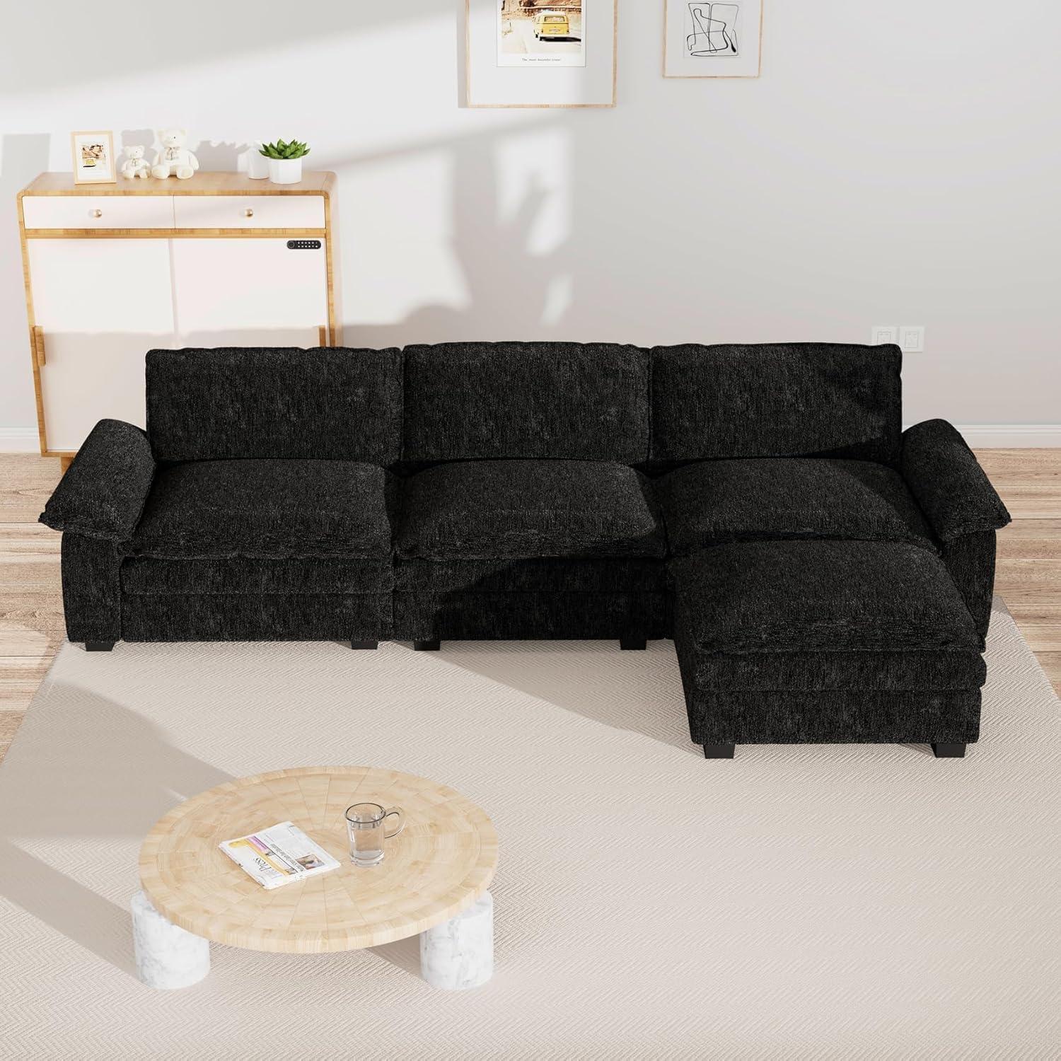 With its sleek black chenille fabric and modern modular design, this sectional sofa effortlessly adapts to a variety of interiors, from minimalist living rooms to cozy apartments and even professional office lounges. The movable ottoman offers incredible flexibility, allowing us to rearrange the seating or create a makeshift coffee table simply by adding a tray. Its low-profile silhouette and neutral tone make it a seamless match for bold accent walls or soft, pastel palettes alike, providing both comfort and style without overpowering the existing decor.