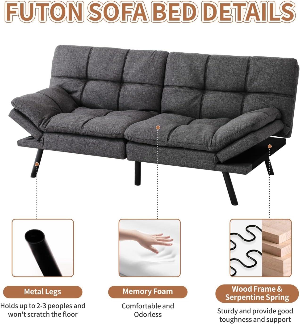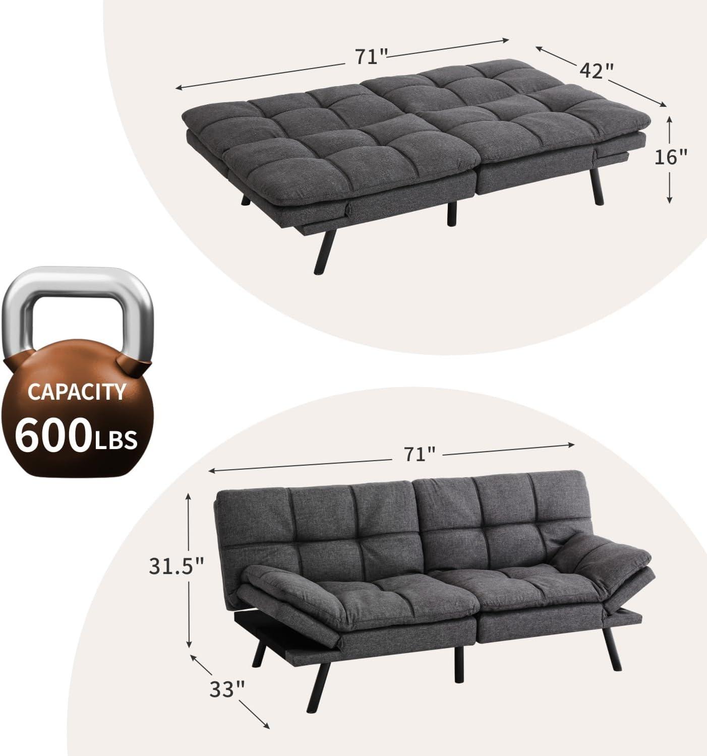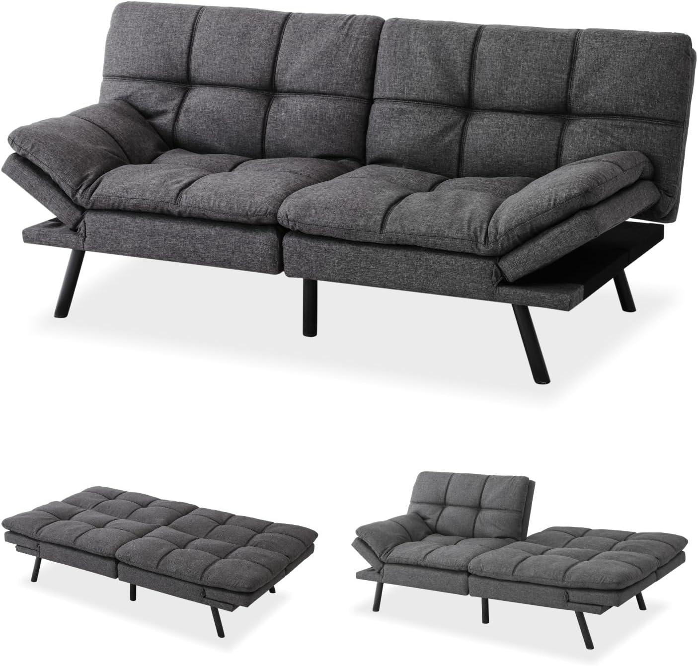 After spending considerable time with this versatile futon,we appreciate how effortlessly it transitions between a comfortable two-seater sofa and a cozy sleeper. The memory foam cushions strike an ideal balance between softness and support, ensuring long-lasting comfort whether sitting or lying down. Its compact footprint and modern dark grey upholstery make it a superb fit for smaller spaces like apartments, dorms, or offices, without compromising style or functionality. The multi-angle adjustable backrest and armrests provide personalized lounging options — from upright conversations to relaxing recline or fully flat for overnight guests.