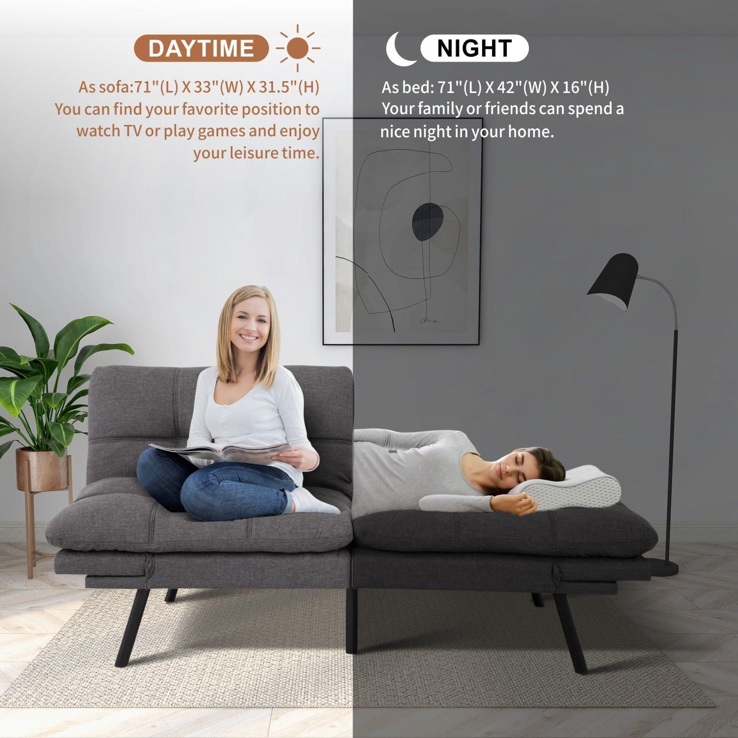 | Memory Foam Comfort: The memory foam cushion blends softness and support,making lounging or sleeping cozy and pressure-free. | Assembly Required: Though straightforward, assembling the sofa bed takes up to 30 minutes and may require two peopel. |
