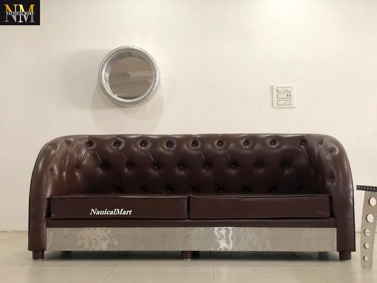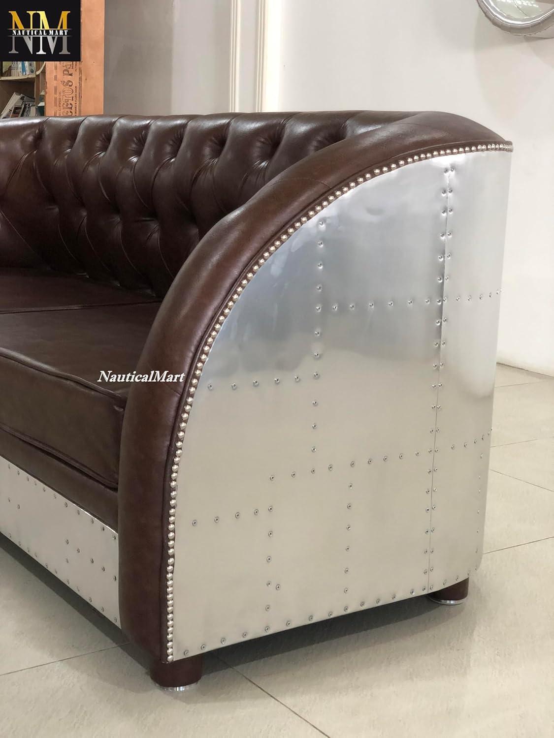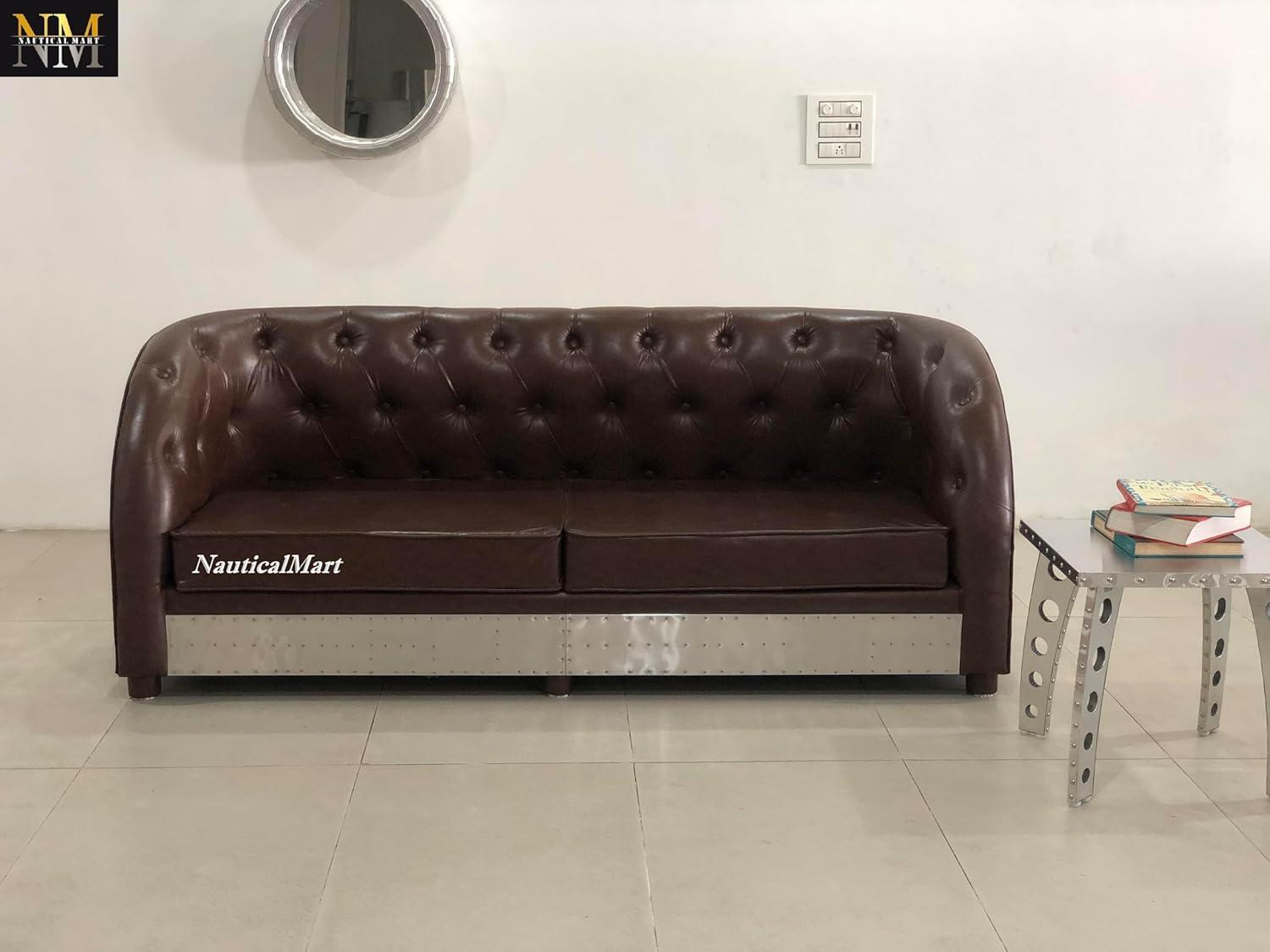 you notice the long product name — NauticalMart Leather Sofa with 3 Seats Aviator Aluminum Loveseat Sofa Home & Living Room Furniture — once,then the piece begins to register in the room on its own terms. Up close the leather feels thick and a little resistant under your palm, the surface threaded with small creases that catch the afternoon light. The aluminum trim has a matte, slightly scuffed look that reads as intentional wear rather than polish, and those riveted edges give the sofa a compact, engineered silhouette. From across the room it reads heavier than it looks up close, the three-seat span balancing on a surprisingly low profile that shapes how the space feels when you move past it.
