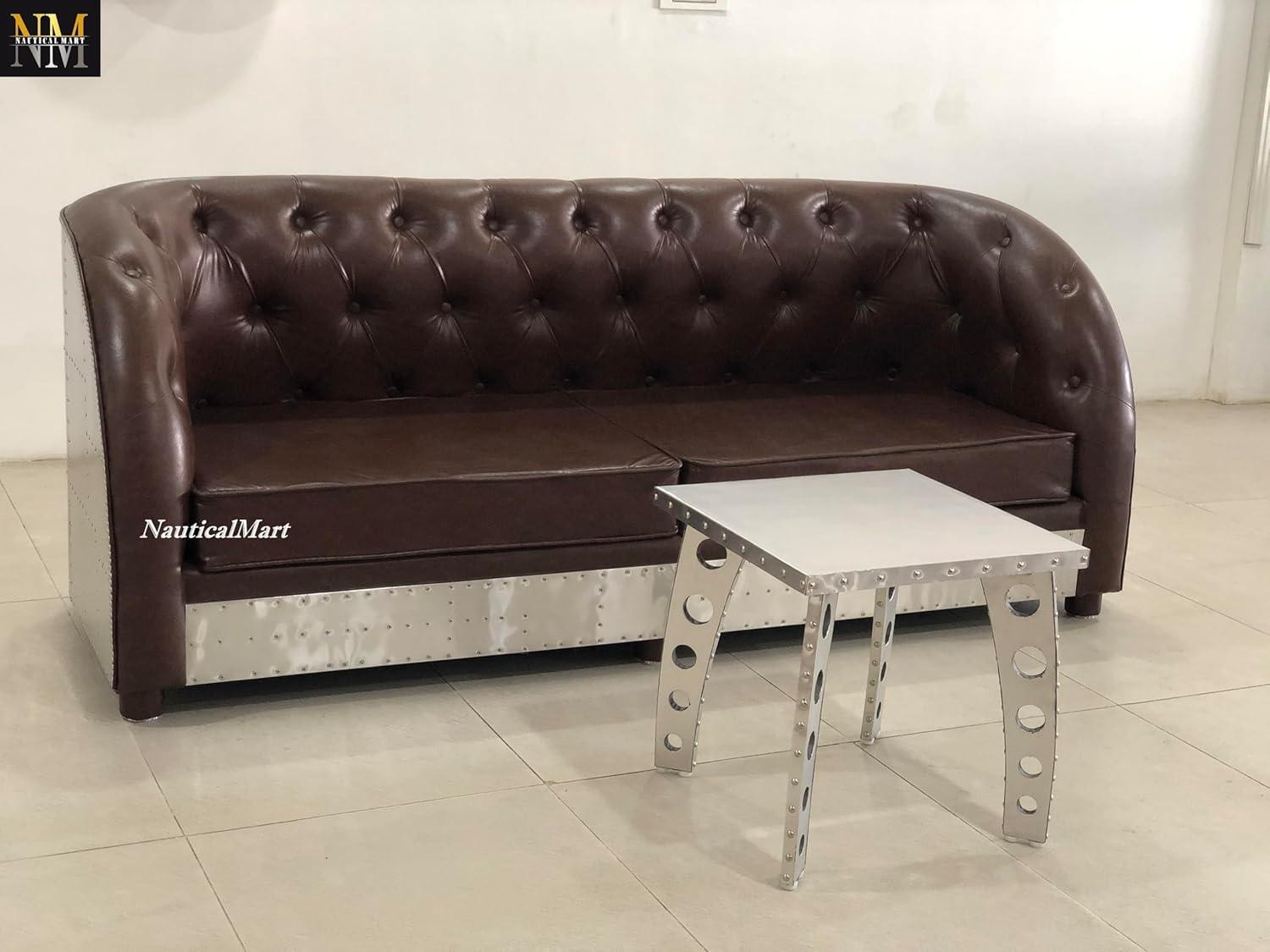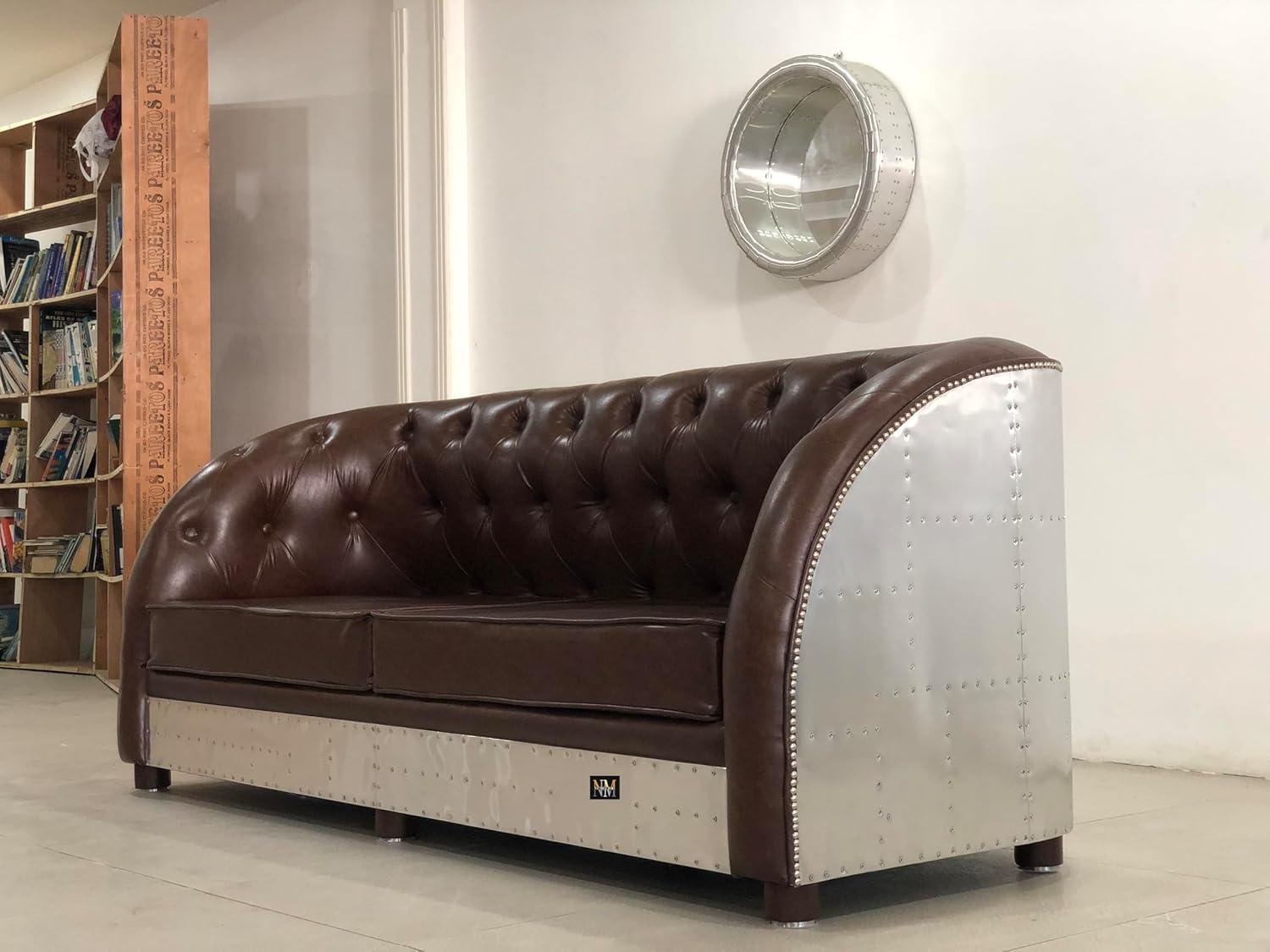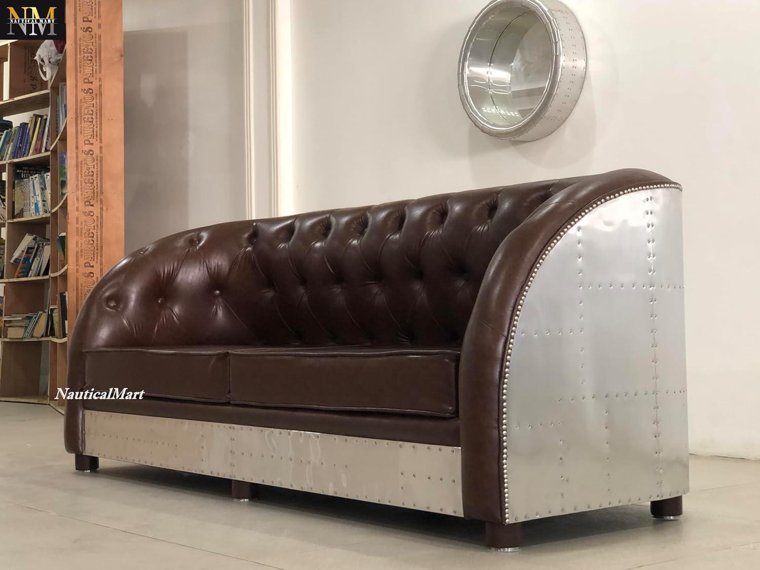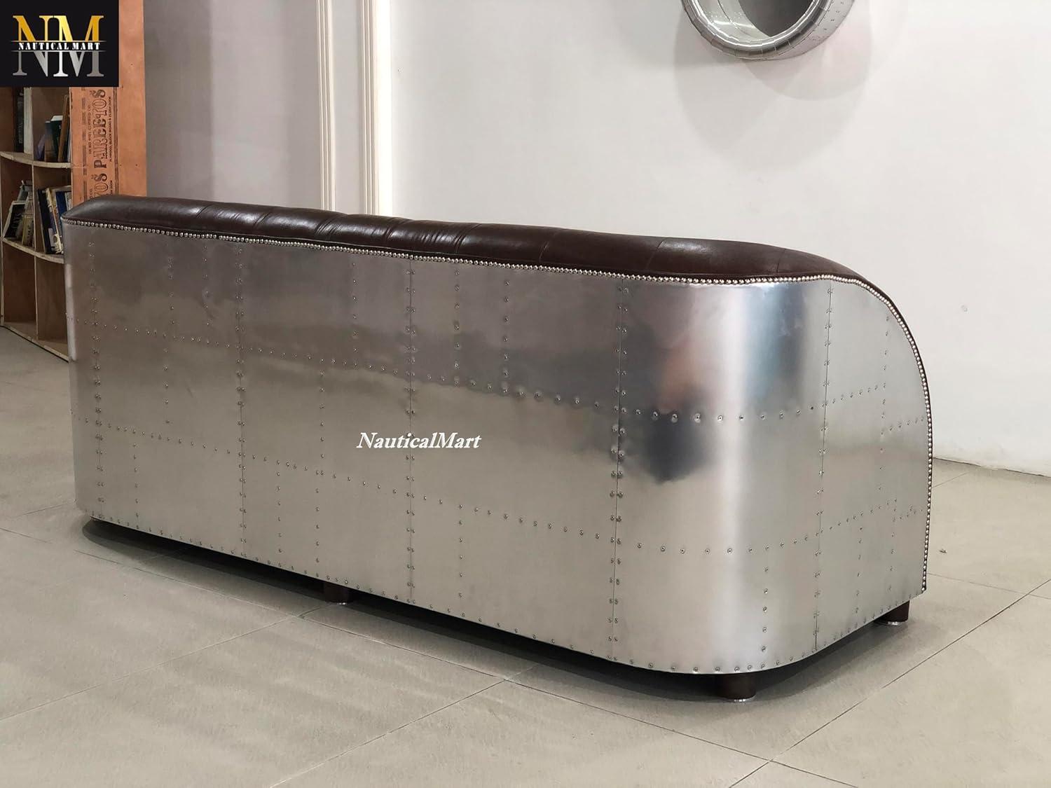 you notice the long product name — NauticalMart Leather Sofa with 3 Seats Aviator Aluminum Loveseat Sofa Home & Living Room Furniture — once,then the piece begins to register in the room on its own terms. Up close the leather feels thick and a little resistant under your palm, the surface threaded with small creases that catch the afternoon light. The aluminum trim has a matte, slightly scuffed look that reads as intentional wear rather than polish, and those riveted edges give the sofa a compact, engineered silhouette. From across the room it reads heavier than it looks up close, the three-seat span balancing on a surprisingly low profile that shapes how the space feels when you move past it.