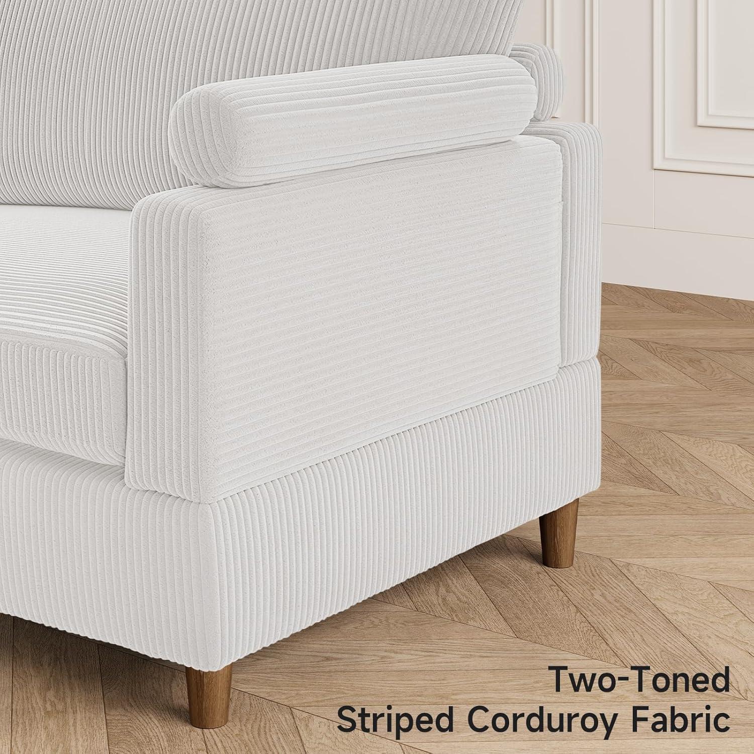 We immediately noticed how this corner seat blends modern aesthetics with tactile appeal through its two-tone corduroy fabric. The raised “cords” create a dynamic texture that feels as inviting as it looks, encouraging us to run our hands along its surface and discover the subtle variations on both sides. Its clean white shade adds a fresh, airy vibe to our living area, effortlessly enhancing the room’s ambiance without overwhelming other décor elements. Beyond appearance, the solid wood legs stand tall and sturdy, securing a strong foundation that supports up to 250 lbs, ensuring lasting durability alongside its stylish design.