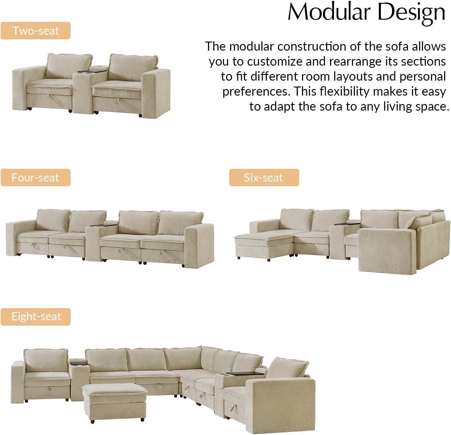 The flexibility of this sofa’s arrangement truly stands out. We loved how easily it adapts to different room sizes and seating needs by configuring as a 2-seat, 4-seat, 6-seat, or full 8-seat layout. The sectional’s pieces lock securely together but can also be rearranged as needed, making it ideal for evolving living room setups. The integration of storage compartments in every seat and the central console with USB and power ports adds practical functionality without compromising the clean, elegant design.