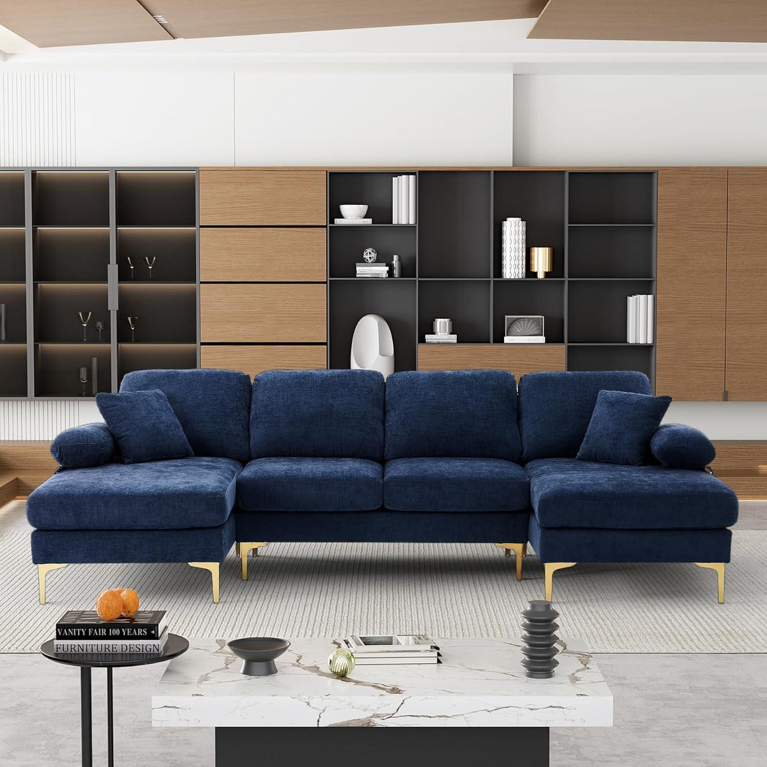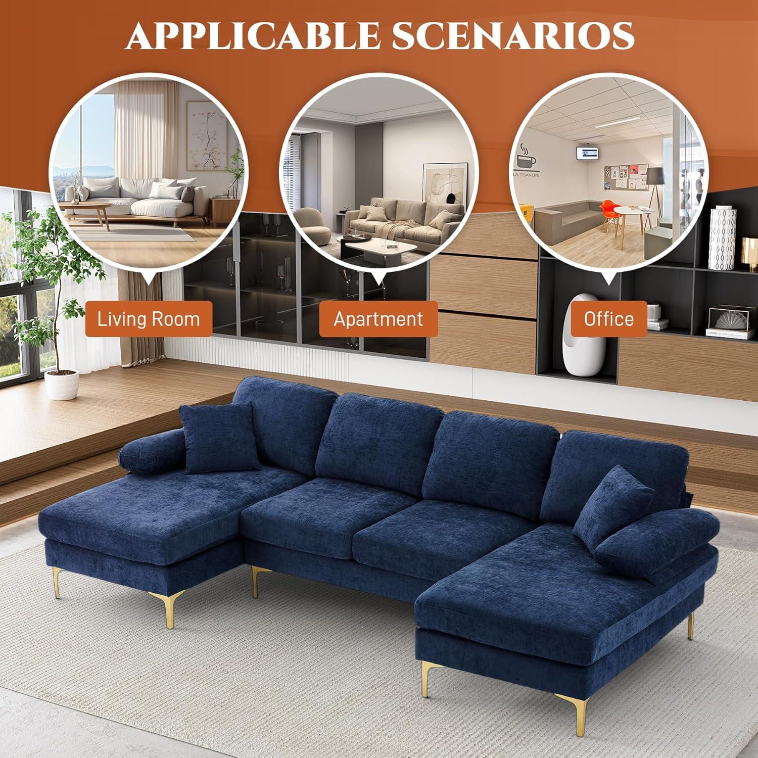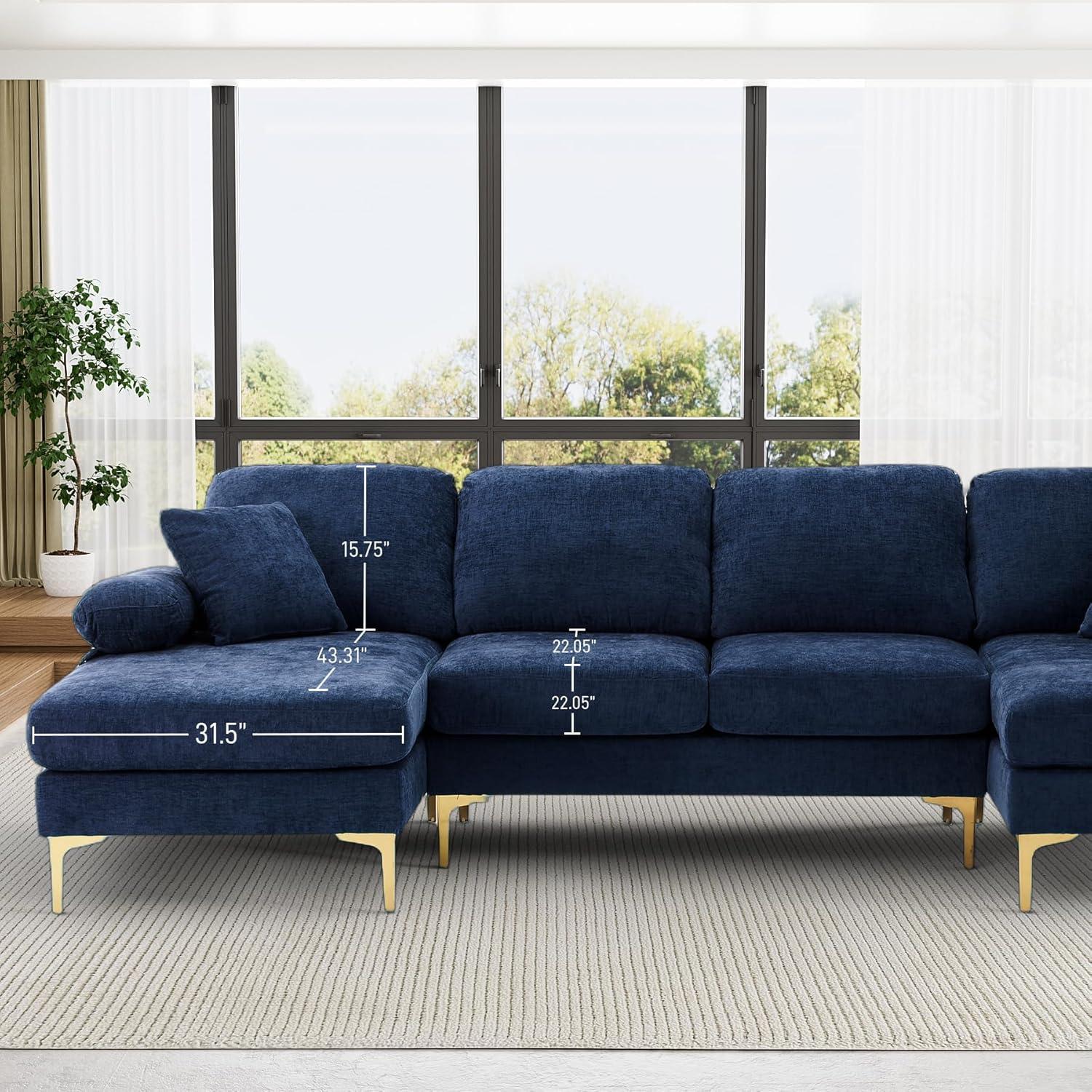From the moment we unpacked this spacious sectional, its modern minimalist design immediately stood out.With smooth, clean lines and a bold blue chenille upholstery, it effortlessly blends with contemporary living spaces. The modular U-shaped layout, including a double chaise lounge, offers plenty of seating and lounging room, making it perfect for family gatherings or relaxing evenings. One practical feature we appreciated was the detachable soft armrests, which can double as comfy pillows or be removed entirely to maximize legroom—adding versatility to the overall experience.