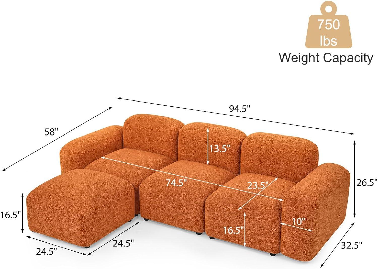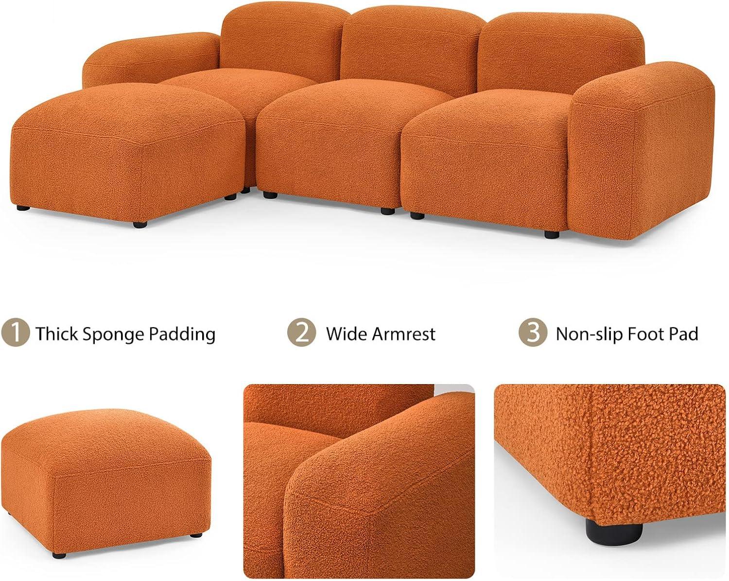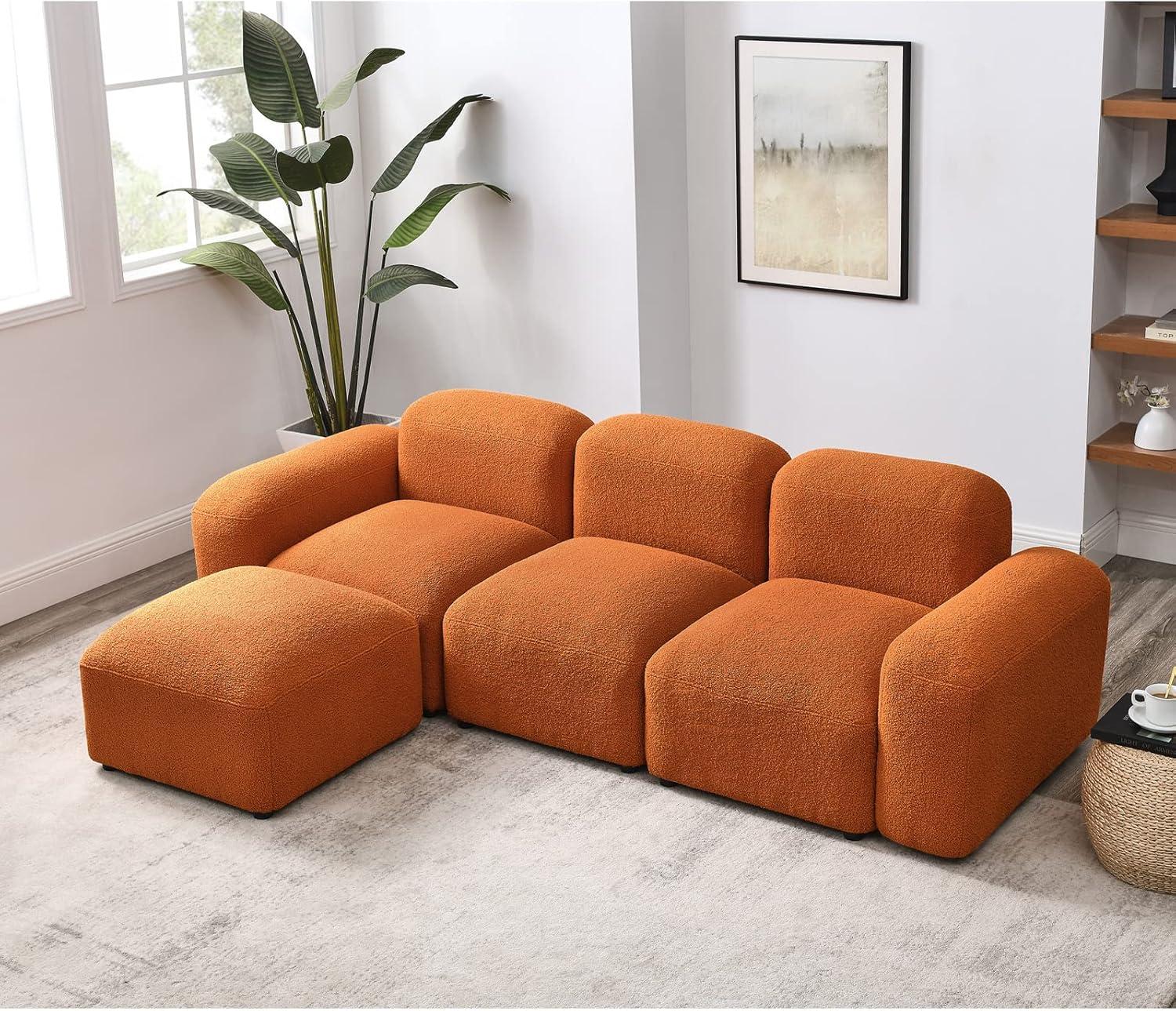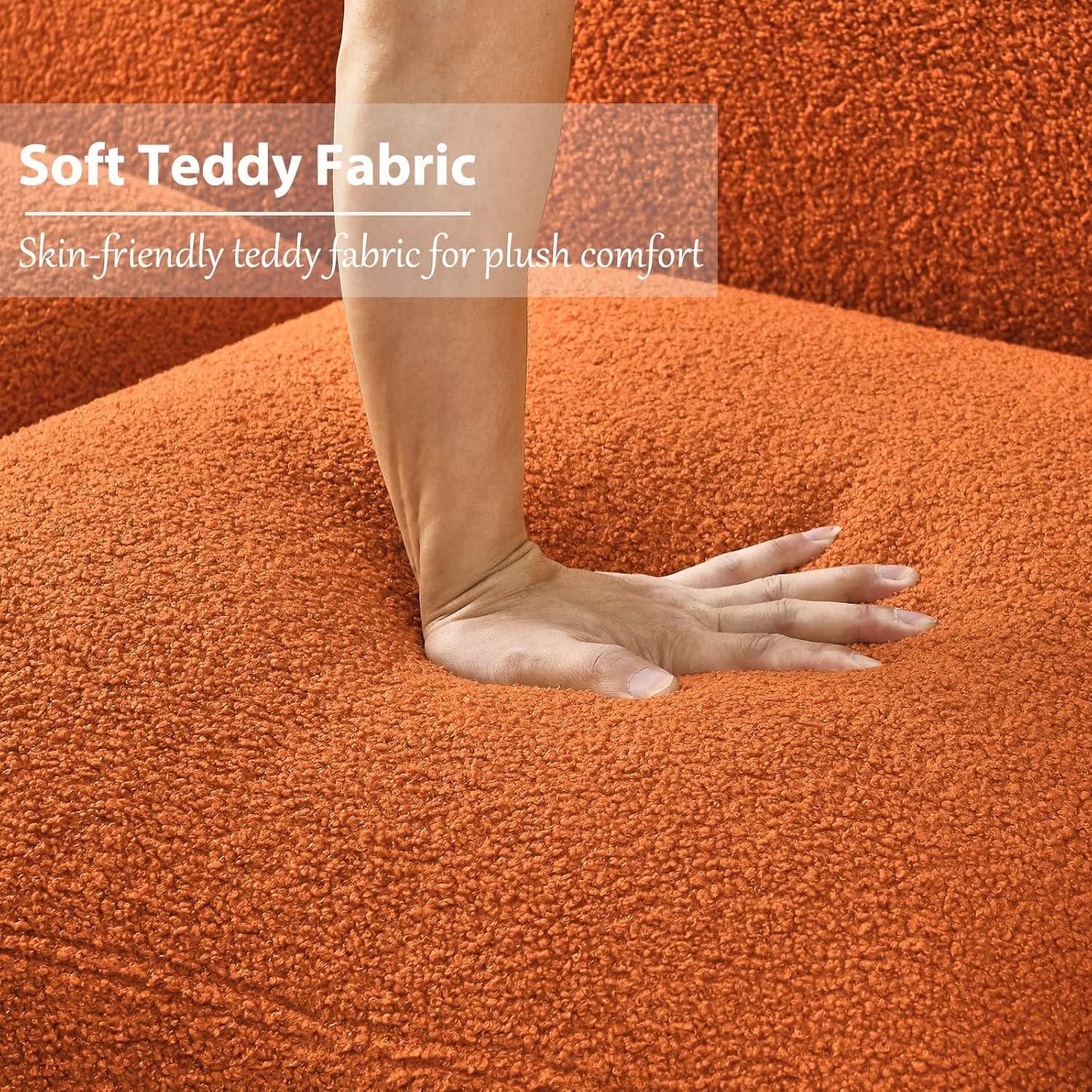 You notice the orange bubble shape before anything else — a low, L-shaped mass that quietly changes the room’s scale. The Taiweny convertible Modular Sectional Sofa (think of it as a teddy L-shaped couch) stretches just under eight feet, with the ottoman sitting like a deliberate pause at one end. Under your palm the sherpa-like teddy fabric has a soft, slightly napped pull, while the cushions give a firm, springy resistance that speaks to dense foam inside. Lift a section adn it separates cleanly; pushed back together the seams tuck in enough to read as one continuous seat. In the afternoon light the orange warms from coral to terracotta, and the whole piece holds a tactile, pleasant visual weight in the living space.