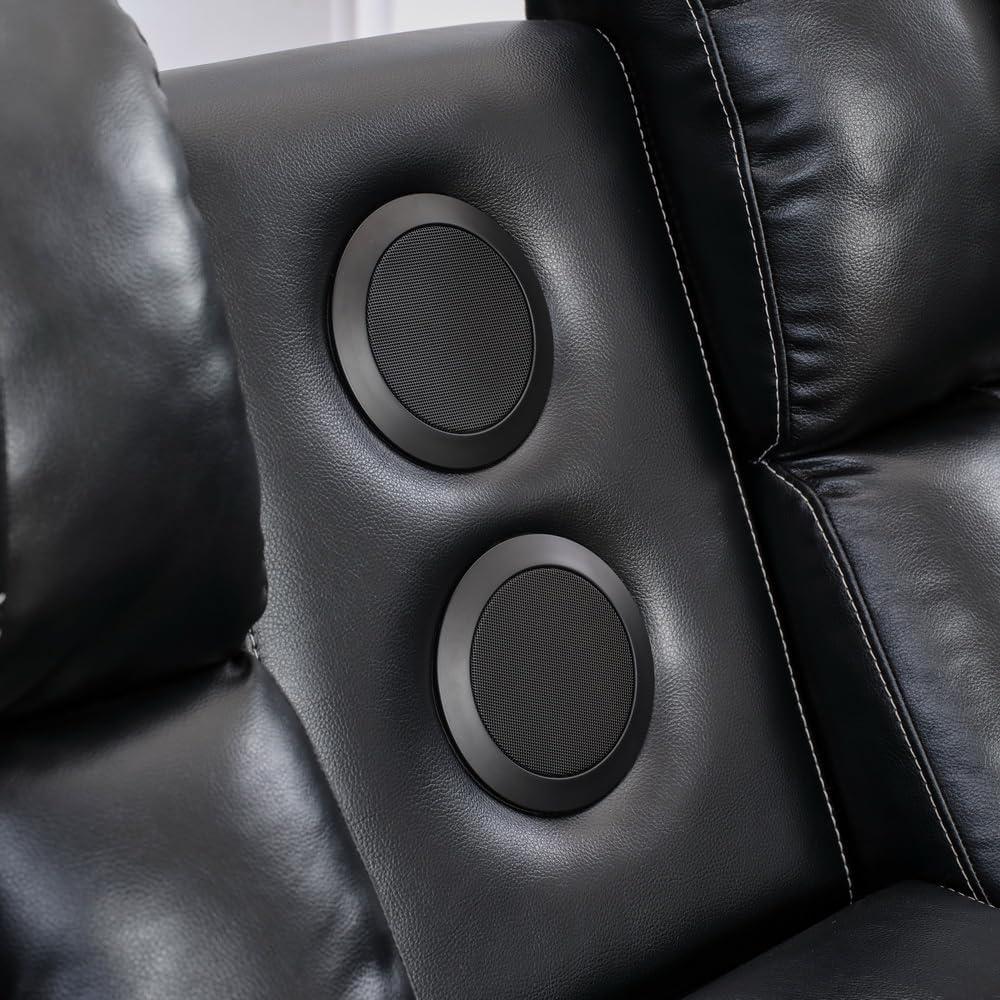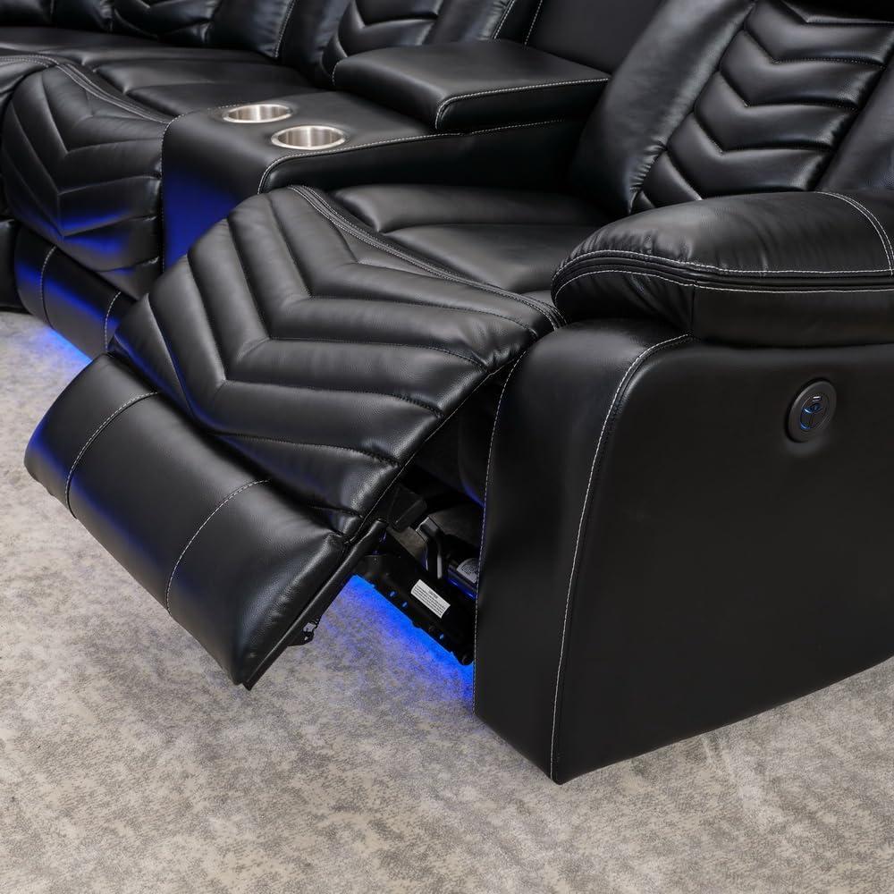 This sectional sofa brilliantly combines comfort, convenience, and modern technology, making it an excellent choice for those seeking a stylish yet functional centerpiece for their living room. Its power reclining features, paired with robust lumbar support and plush padding, deliver an indulgent relaxation experience.The integrated Bluetooth speakers and customizable LED lighting take entertainment to the next level, perfect for movie marathons, immersive gaming sessions, or simply setting a cozy ambiance. Built with a solid hardwood frame and durable faux leather upholstery,it promises longevity while maintaining an elegant look that is easy to clean and maintain.