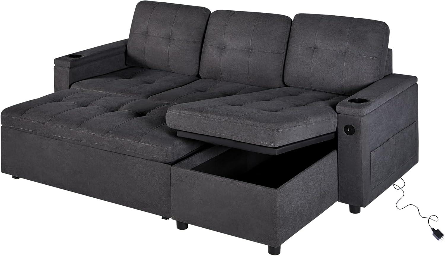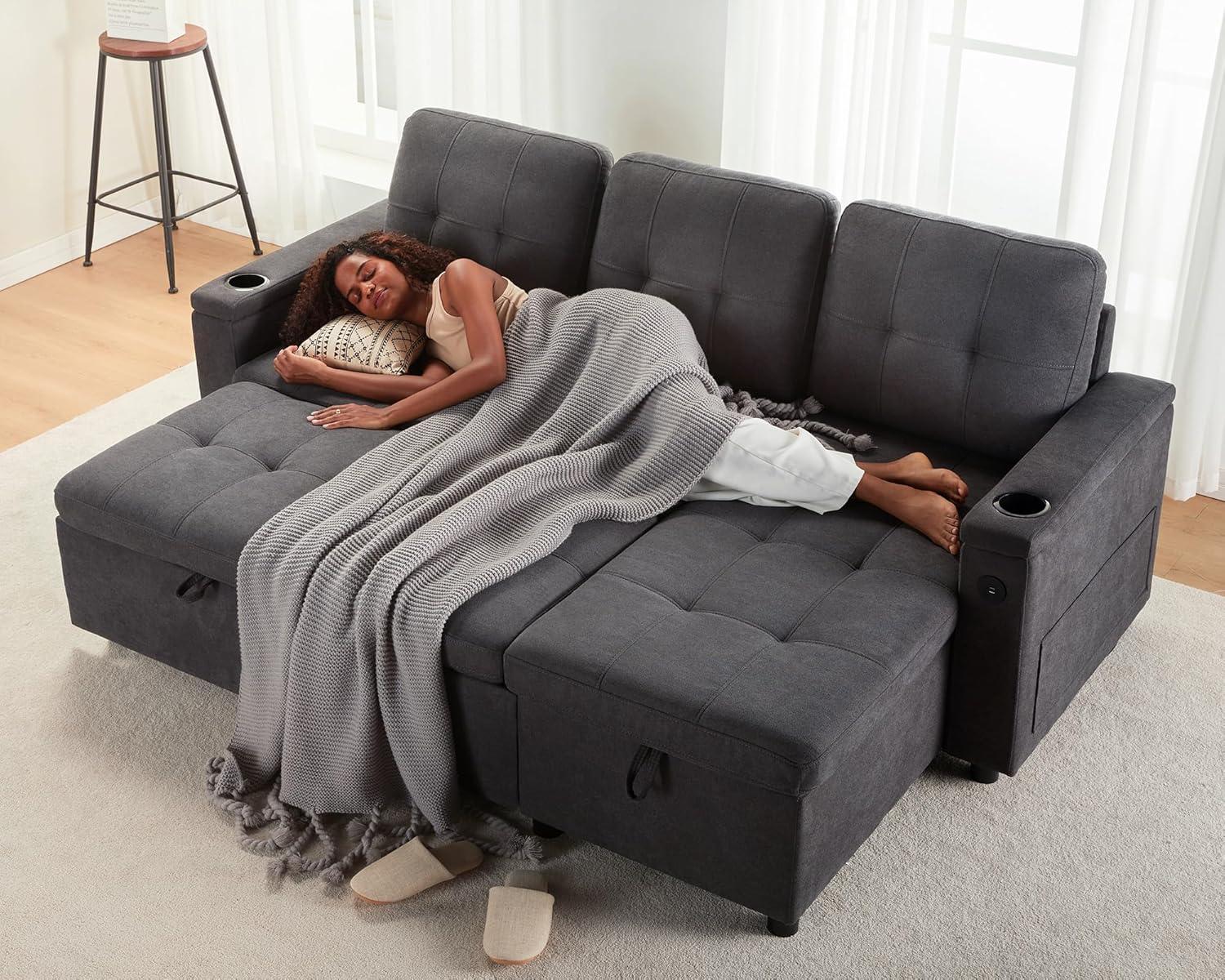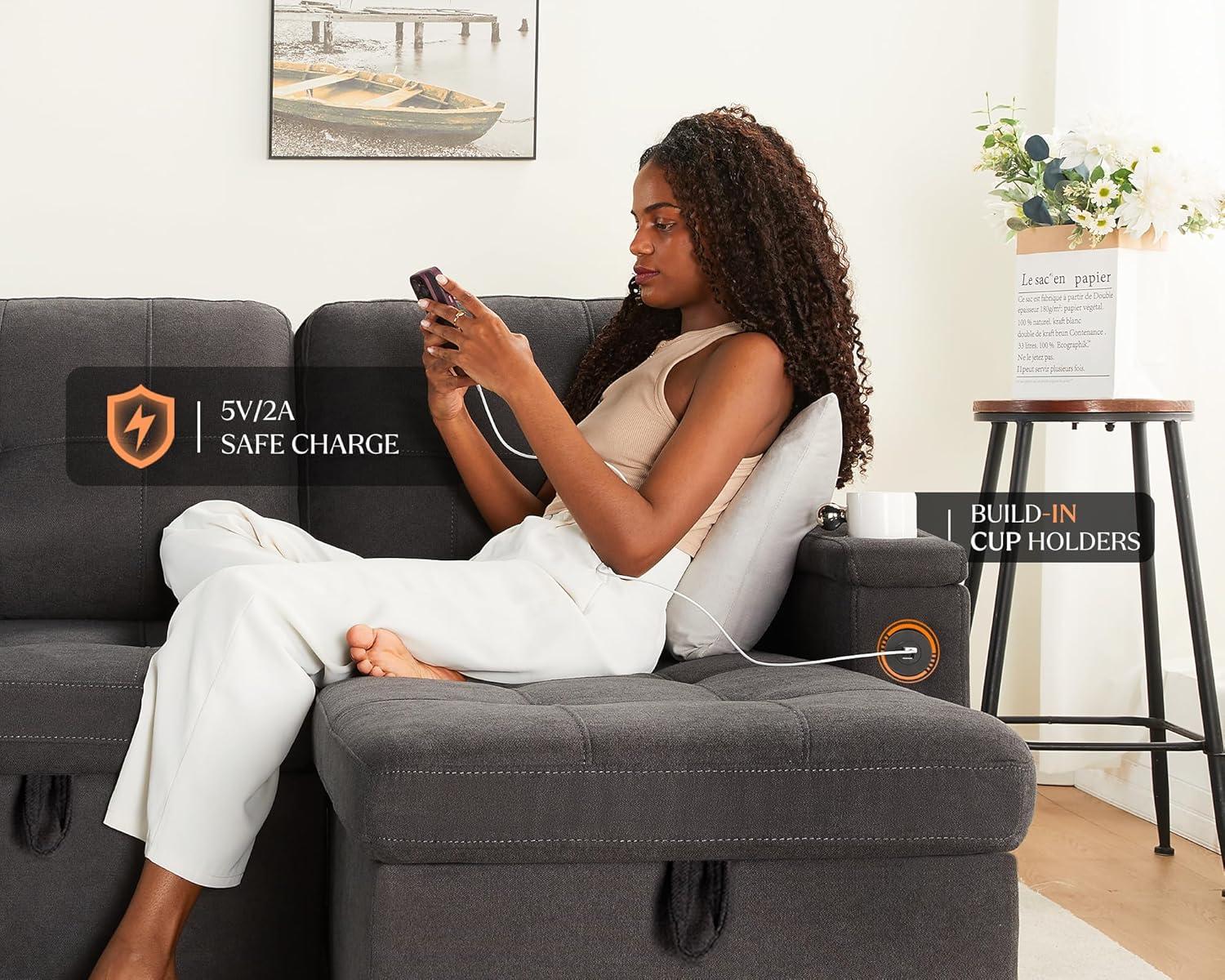 After spending considerable time with this L-shaped sectional, we appreciate how it blends comfort, functionality, and style in one piece. The pull-out bed effortlessly transforms the sofa into a cozy sleeping space, perfect for accommodating overnight guests without hassle. We especially valued the generous storage beneath the chaise and in the armrest, where bedding and small items can be neatly tucked away — a smart use of space that helps keep the living room clutter-free. The inclusion of USB charging ports and built-in cup holders adds a modern touch, making it a practical choice for both relaxation and entertaining.