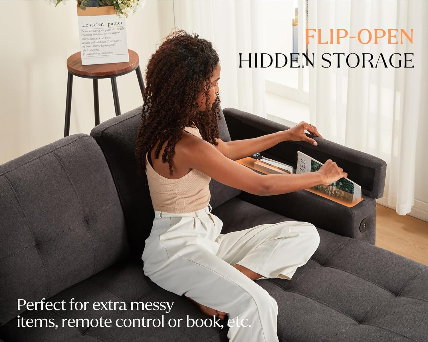 The design brilliantly maximizes every inch of your living room. The L-shaped sectional offers generous seating for family gatherings or casual lounging, while the storage chaise underneath provides an excellent solution to keep blankets, pillows, or seasonal decor neatly tucked away. we especially appreciate the hidden compartments in the armrest, perfect for stashing remote controls, books, or other small essentials, keeping the area clutter-free and inviting.