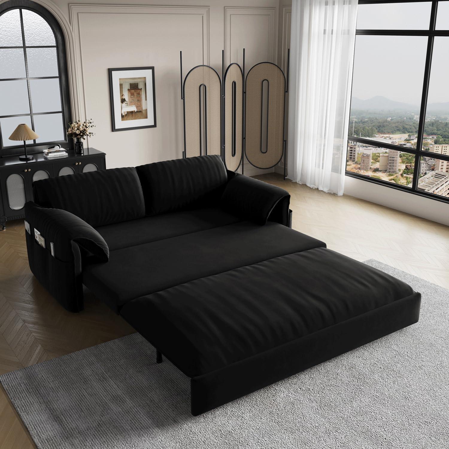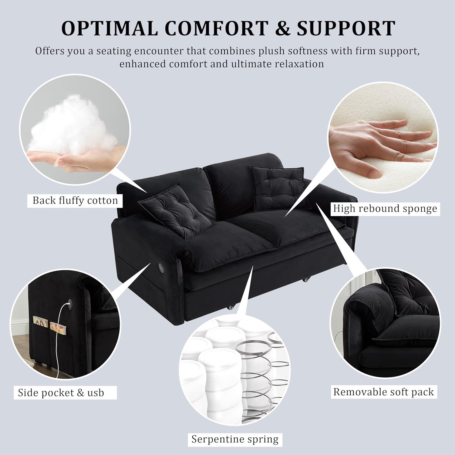 This versatile piece of furniture combines comfort, style, and functionality into one sleek design. Upholstered in soft, breathable velvet, it offers a plush seating experience complemented by two cozy pillows. the high-density foam cushions provide excellent support,making it perfect for long hours of relaxation. Crafted with a durable steel frame reinforced with double supports, this loveseat stands firm and stable without any worries of tipping or wear.We especially appreciate the smooth, noiseless rollers that allow the pull-out queen-size bed to glide effortlessly without scratching floors or disturbing the household.